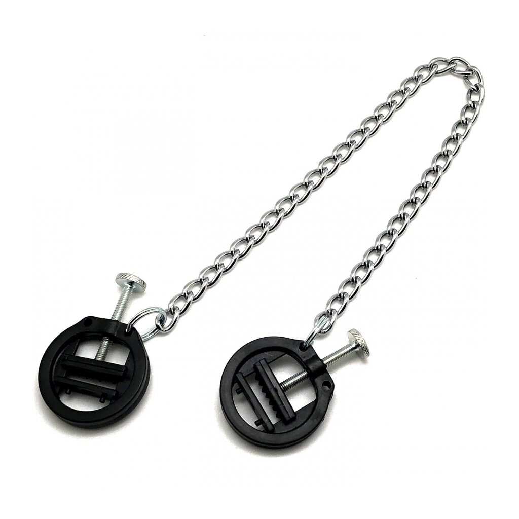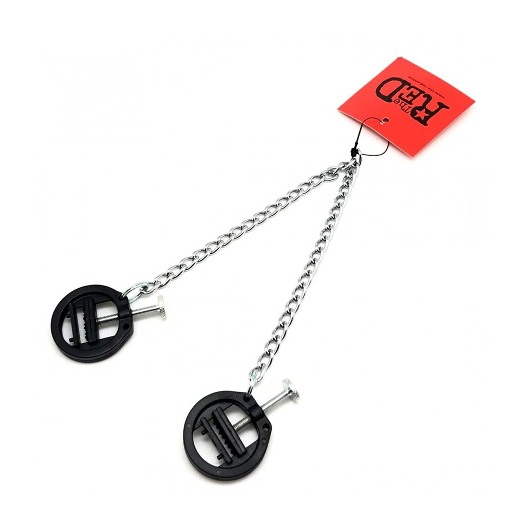 The PVC breast clamps with chain have a diameter of 4 cm. The chain is 30 cm long. Weight: 48 gr / Width: 5.5 cm / Depth: 1.5 cm / Height: 10.0 cm