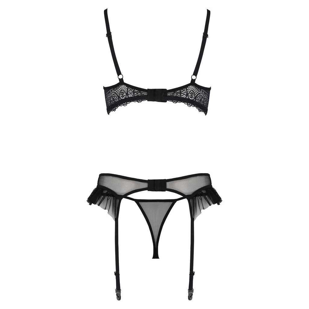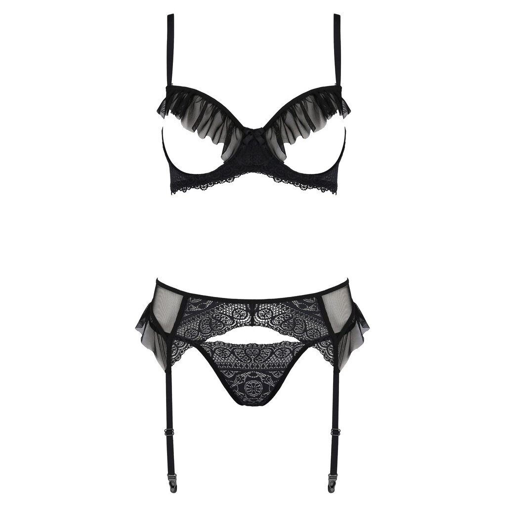 Bügel-BH, Strapsgurt und Riostring im Kerria set with open bra aus der Eco Collection von Passion. Alle drei Teile aus transparentem elastischem Powernet im Mix mit feiner fantasievoller Spitze. Bügel-BH mit offenen Cups und verspielten Volants, genauso wie der Strapsgurt. Beides mit Hakenverschluss im Rücken. Der Riosstring mit Spitzenfront hat seitlich nur schmale Stretchbänder. BH-Träger und Strumpfhalter sind für perfekte Passform in der Länge verstellbar.