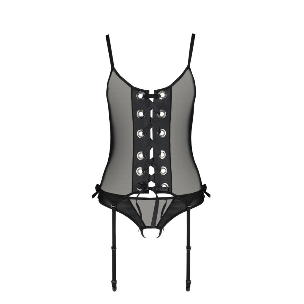 - Elegant suspender corsage made of a mix of soft tulle as well as leather-like material