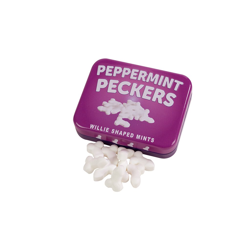 These fun Peppermint Pecker embossed tins contain 45 grams of Willie-shaped mini mints, an ideal lozenge for instant freshness before and after meals! Satisfaction and fresh breath are guaranteed. Practical for any situation that requires a quick refresher! 45 grams / Ingredients: Sorbitol, anti-caking agent, magnesium salts of fatty acids, flavourings, artificial sweeteners (asparatams, acesulframe K)