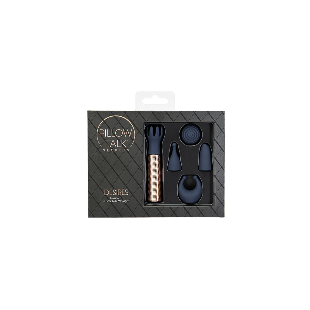 Élargissez votre monde de plaisir avec le set Pillow Talk Secrets Desires, composé de 6 pièces ! Ce luxueux set est un excellent point de départ pour tous ceux qui souhaitent explorer le monde sensuel et intense des vibromasseurs Bullet. Propulsé par l'incroyable moteur PowerBullet, Desires vous procure des vibrations profondes à des vitesses allant de douces à sauvages. La vitesse progressive est facile à contrôler en appuyant sur le bouton de la base et en le maintenant enfoncé. C'est vous qui contrôlez votre niveau de plaisir ! Desires dispose de 5 têtes en silicone interchangeables, chacune avec sa propre forme et ses sensations uniques. La tête classique Lipstick offre une pointe lisse et coudée pour une couverture de surface sensationnelle. La pointe Pinpoint a une boule étroite pour une transmission précise des vibrations et la pointe Dual Pinpoint a deux pointes de boule pour une double précision et est parfaite pour les jeux de mamelons. Le Grooved Orb a des rainures rondes qui transmettent les vibrations à des vagues de bonheur de mordillement des lèvres. Enfin, la tête Tickler possède 8 doigts doux disposés en cercle pour taquiner et chatouiller les mamelons ou autres zones sensibles. Chaque tête se détache de la base de la boule d'une simple traction et se remet en place d'une simple pression. Elles sont fabriquées en silicone 100% compatible avec le corps humain et sont faciles à nettoyer.