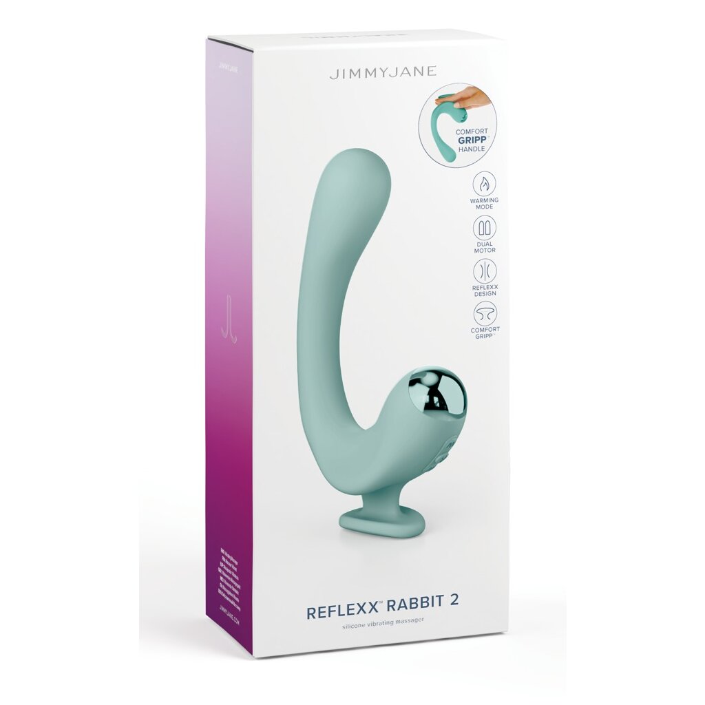 Flexibler Reflexx Rabbit 2 Doppelvibrator von JimmyJane für die doppelte Stimulation von Vagina/G-Zone und Klitoris. Mit seinem U-förmigen Design und der flexiblen Federung passt er sich perfekt an den Körper und die Bewegungen beim Verwöhnen an. Er ist so anschmiegsam, dass er genau den richtigen Druck ausübt, damit die kraftvollen Vibrationen gleichzeitig außen und innen intensiv zu spüren sind. Mit dem praktischen 2-Finger-Griff lässt er sich leicht halten, kontrollieren und dirigieren.