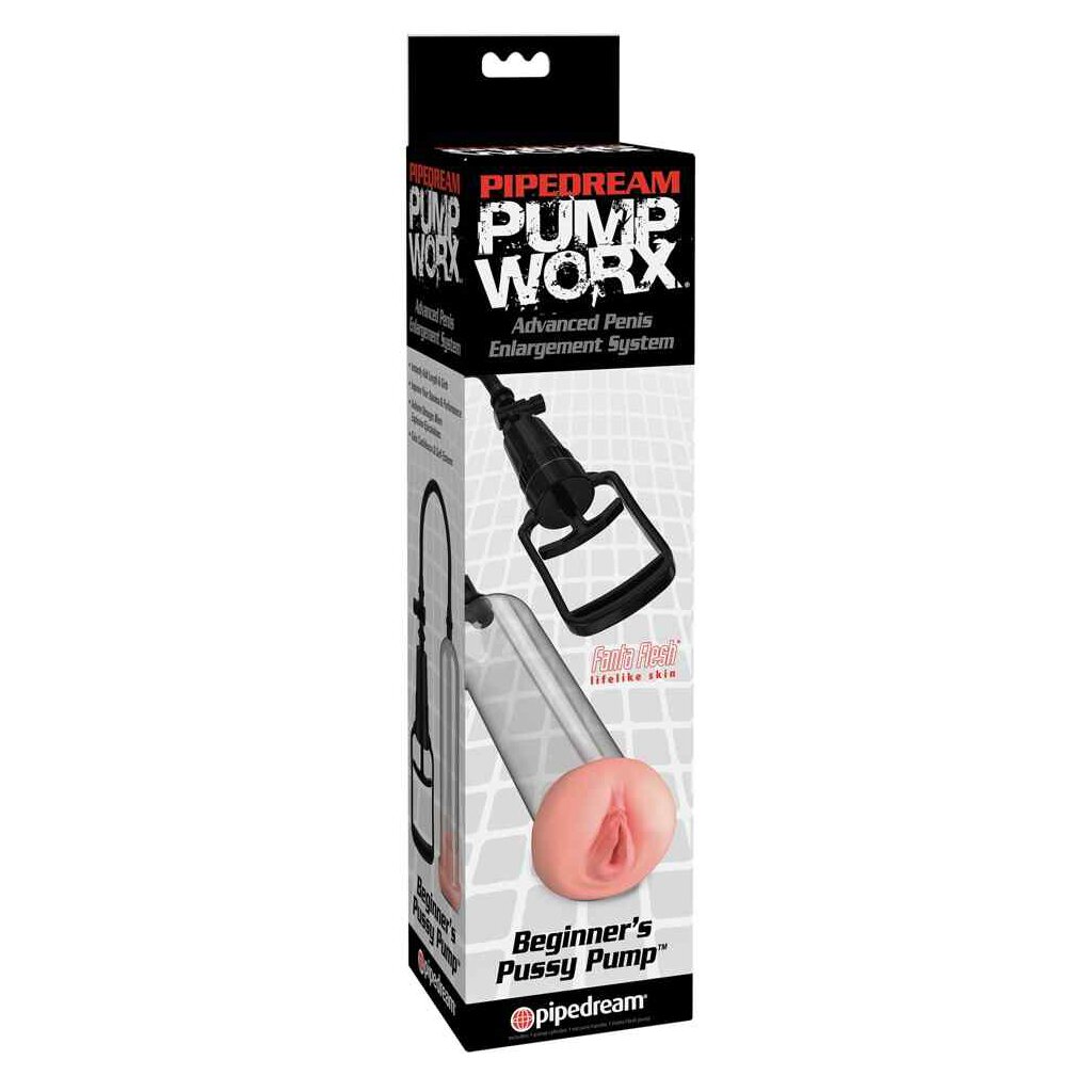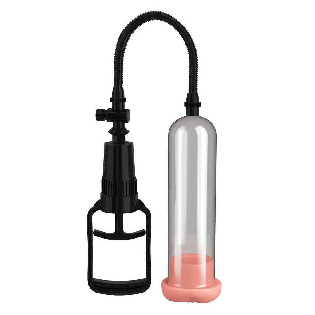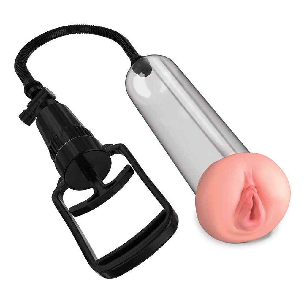 Transparent penis pump with an easy-grip handle and safety valve and a vagina hole. For men who want effective potency training. With pleasant sucking stimulation – like during a blowjob.