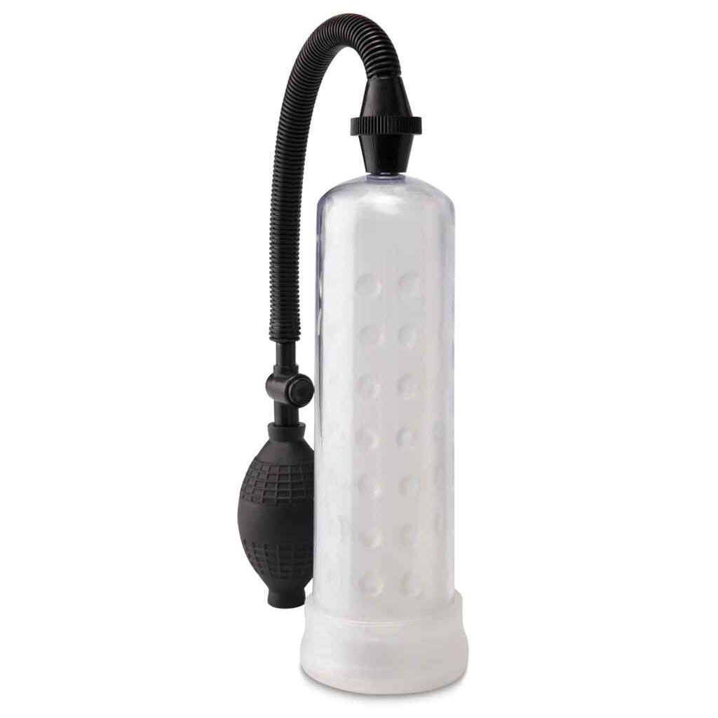 Transparent penis pump with a ball pump and safety valve. The textured cylinder surface is great for a non-slip fit. For men who want effective potency training. With pleasant sucking stimulation – like during a blowjob. This model also has very strong suction and the sleeve is dotted for additional stimulation.