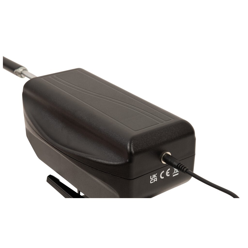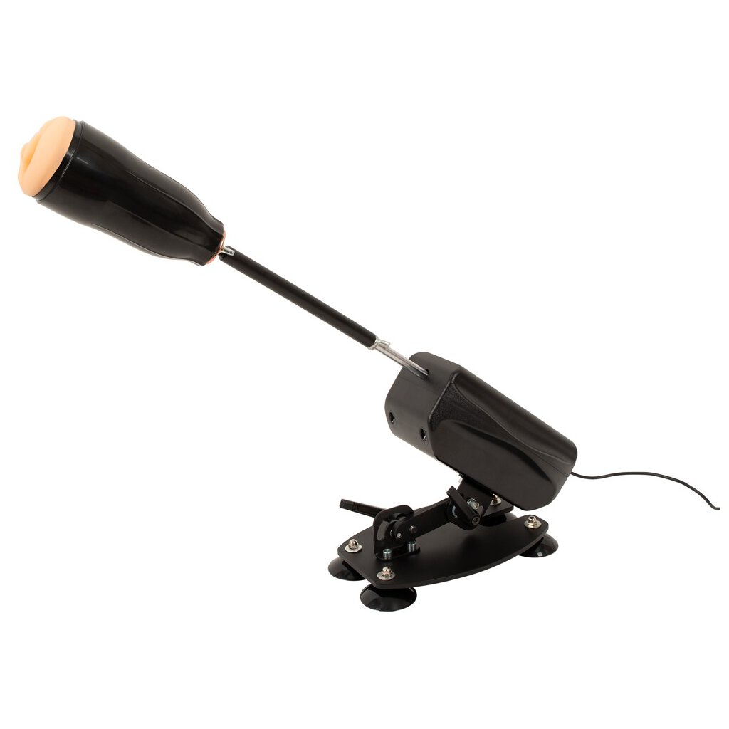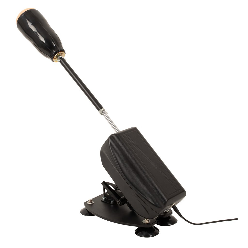 Sex-Maschine (22 cm x 15 cm x 17 cm), Stange 12 cm lang, Verlängerungsstange 20 cm lang. Stromkabel inkl. Adapter 280 cm lang. Metall, ABS, PVC, TPE.