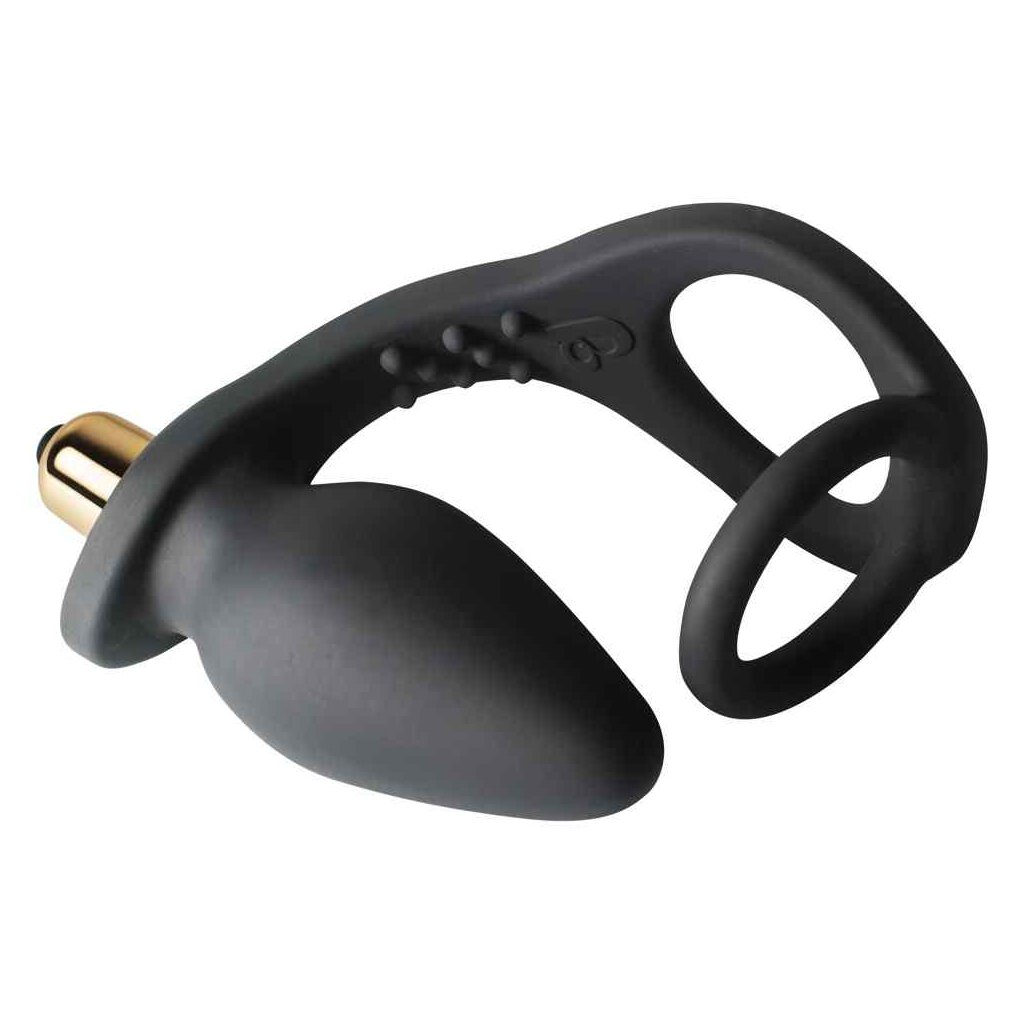 Double anneau avec vibrateur anal. Noir. Longueur totale d'environ 14 cm. Ø des anneaux flexibles 3,1 et 3,7 cm. Étanche. Matériau : silicone. Piles incluses.