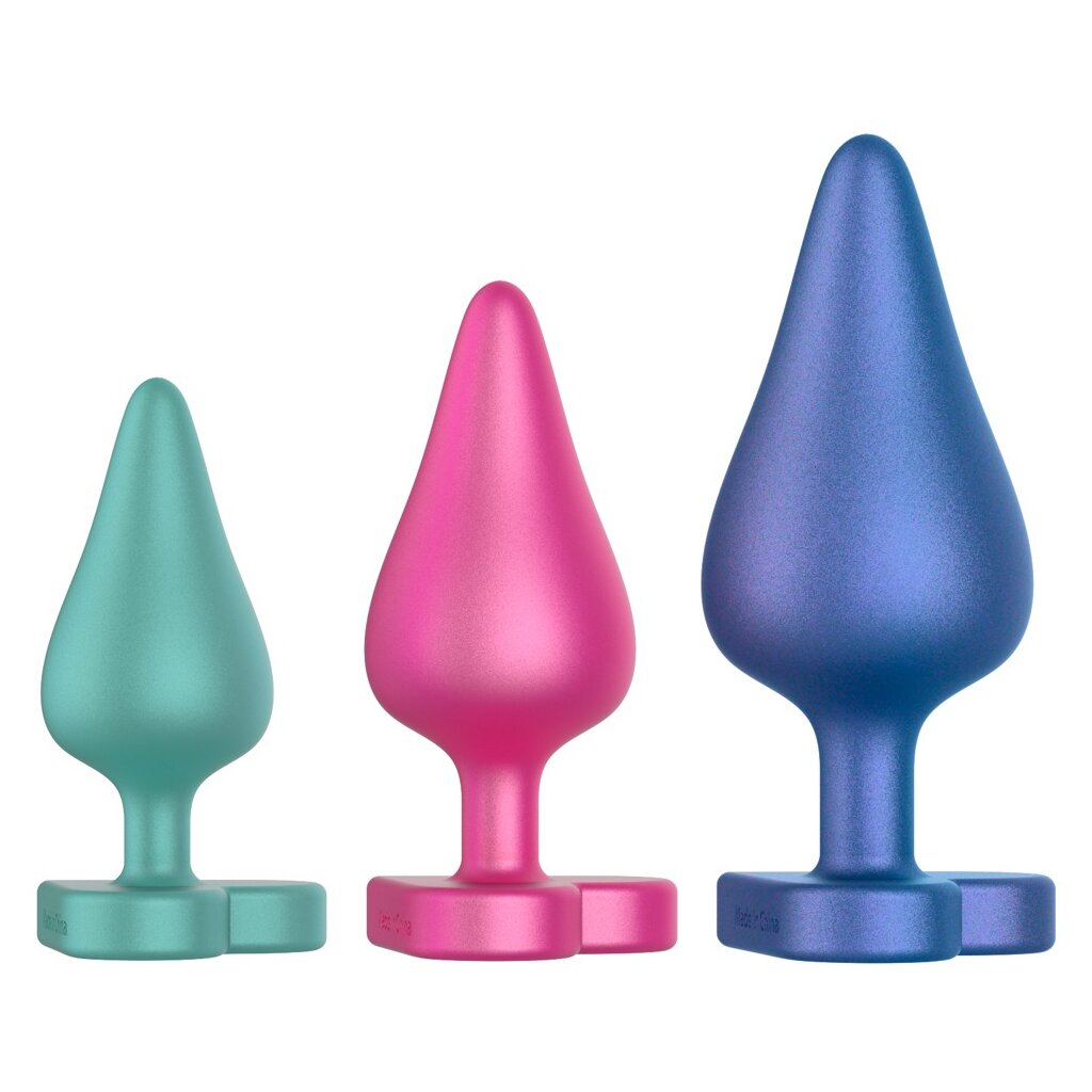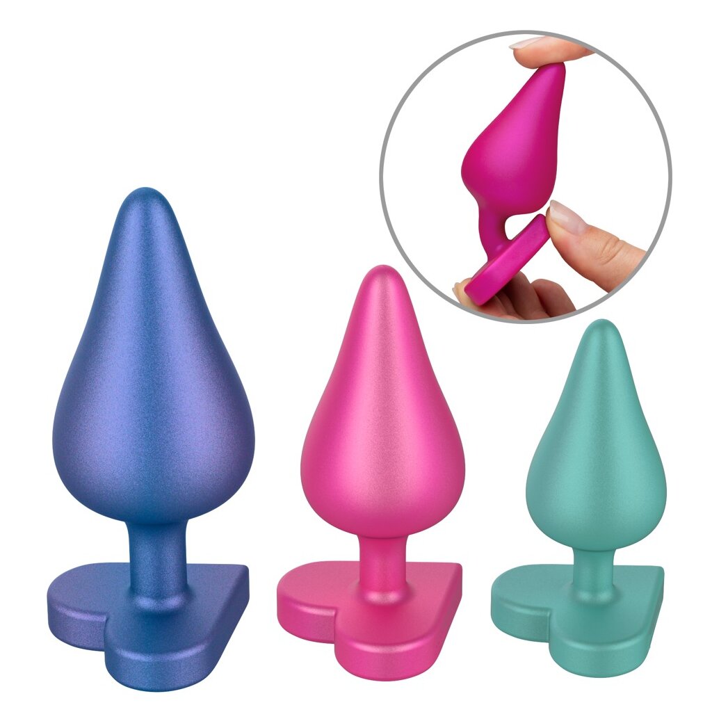 3 x Analplug im Anal Training Set Luster von ROMP in verschiedenen Größen und trendigen Farben mit edlem Metallic-Schimmer. Perfekt für rektale Stimulation und Dehntraining. Jeder konisch geformte, glatte Plug mit einfühlsamer Spitze und analsicherem, herzförmigem Stopper. Alle drei Analplugs angenehm flexibel und aus seidig softem Silikon für leichtes Einführen, optimale Anpassung und höchsten Komfort. Ideal für Analspaß-Anfänger:innen!