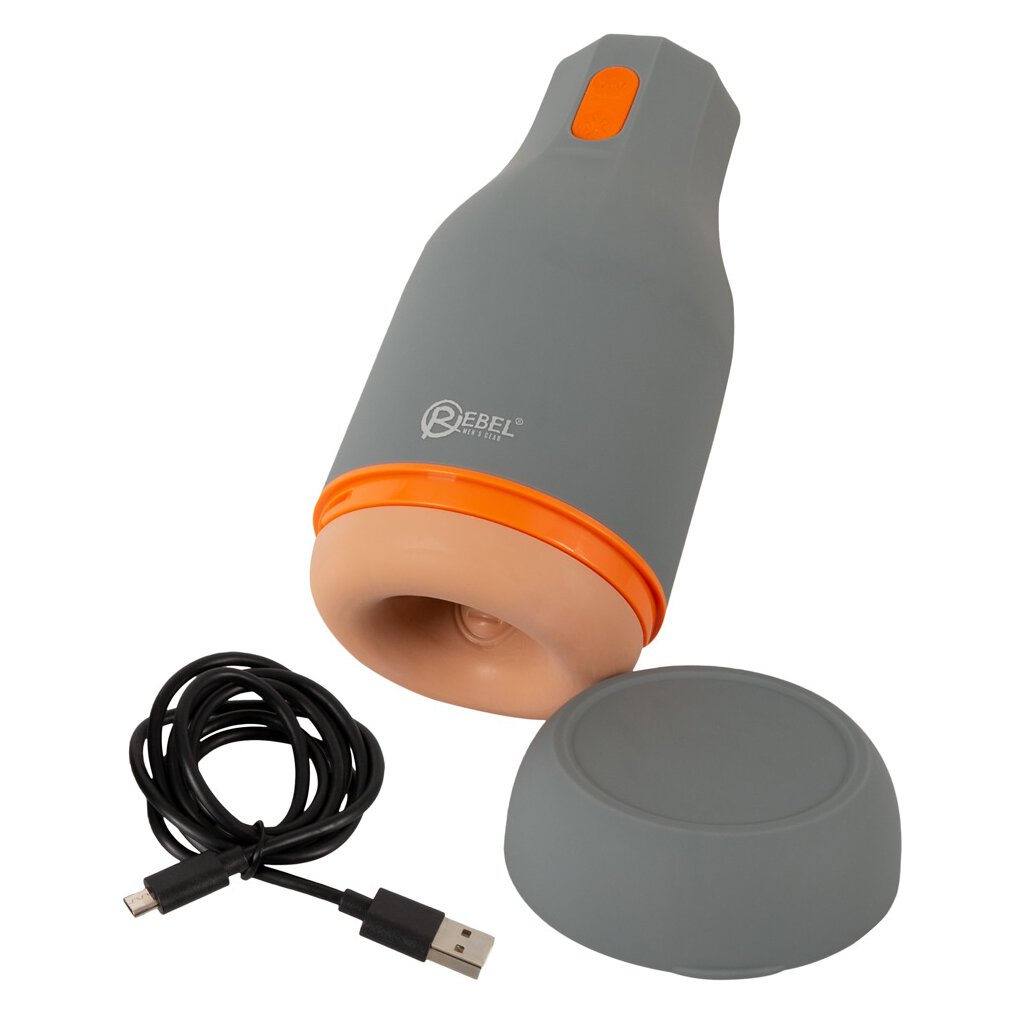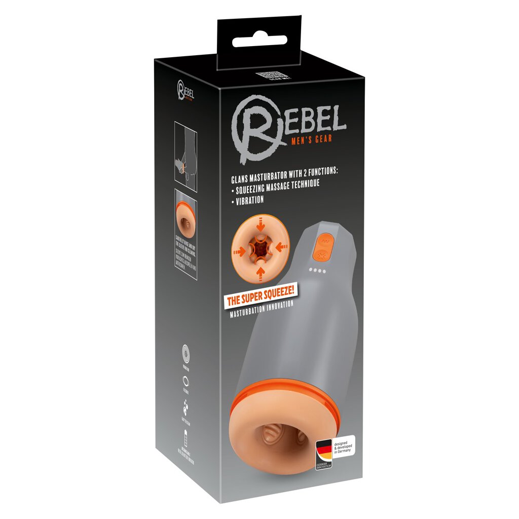Handlicher kompakter Glans Masturbator with 2 Functions von Rebel, der mit neuer innovativer rhythmischer Massagetechnik (The Super Squeeze!) und prickelnden Vibrationen direkt die Eichel und das Frenulum verwöhnt. Weltneuheit: Design und technische Entwicklung made in Germany!