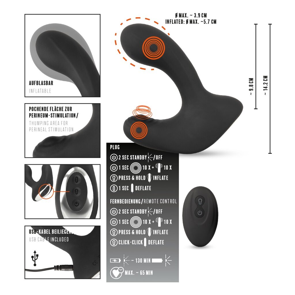 Le plug peut être facilement gonflé en appuyant sur un bouton - pour une sensation merveilleusement remplie et un parfait exercice d'étirement anal. Grâce à la télécommande pratique, les 10 modes variés de vibrations et de tapotements pulsés, ainsi que la fonction de relâchement de la pression d'air peuvent également être contrôlés de manière pratique par simple pression d'un bouton. Avec une portée allant jusqu'à 8 mètres, même pour le partenaire.