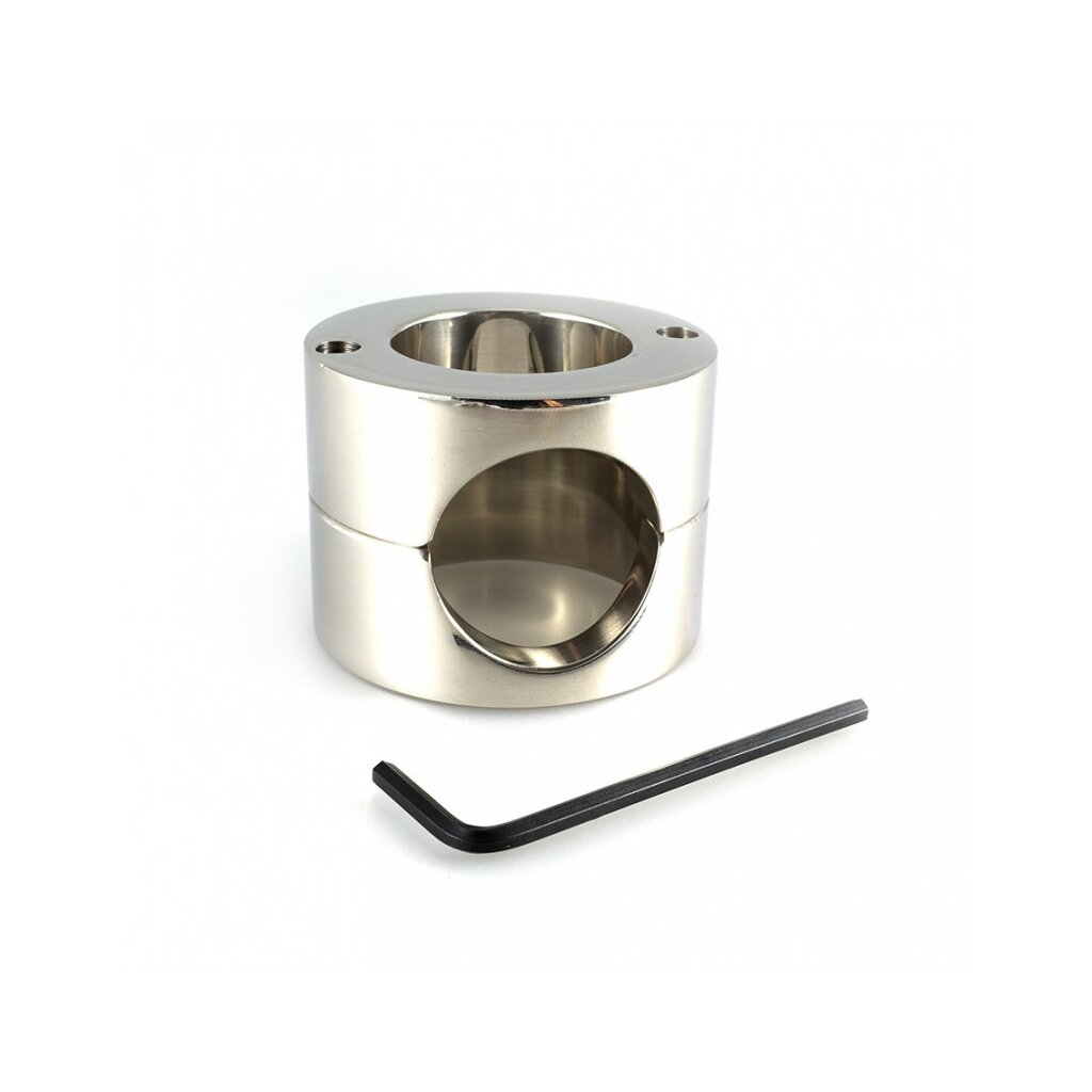 Der Rimba zweiteilige Hodensackstretcher aus massivem Metall ist ein Toy für erfahrene Liebhaber intensiver Dehnung und präziser Kontrolle. Mit seiner Höhe von 4,5 cm und den unterschiedlich großen Öffnungen – 3,5 cm seitlich und oben, 4,5 cm unten – sorgt er für ein spürbares, gleichmäßiges Ziehen des Hodensacks und bietet gleichzeitig eine exakte, stabile Passform.