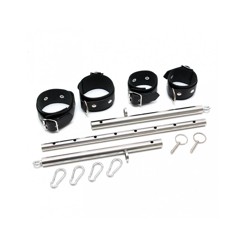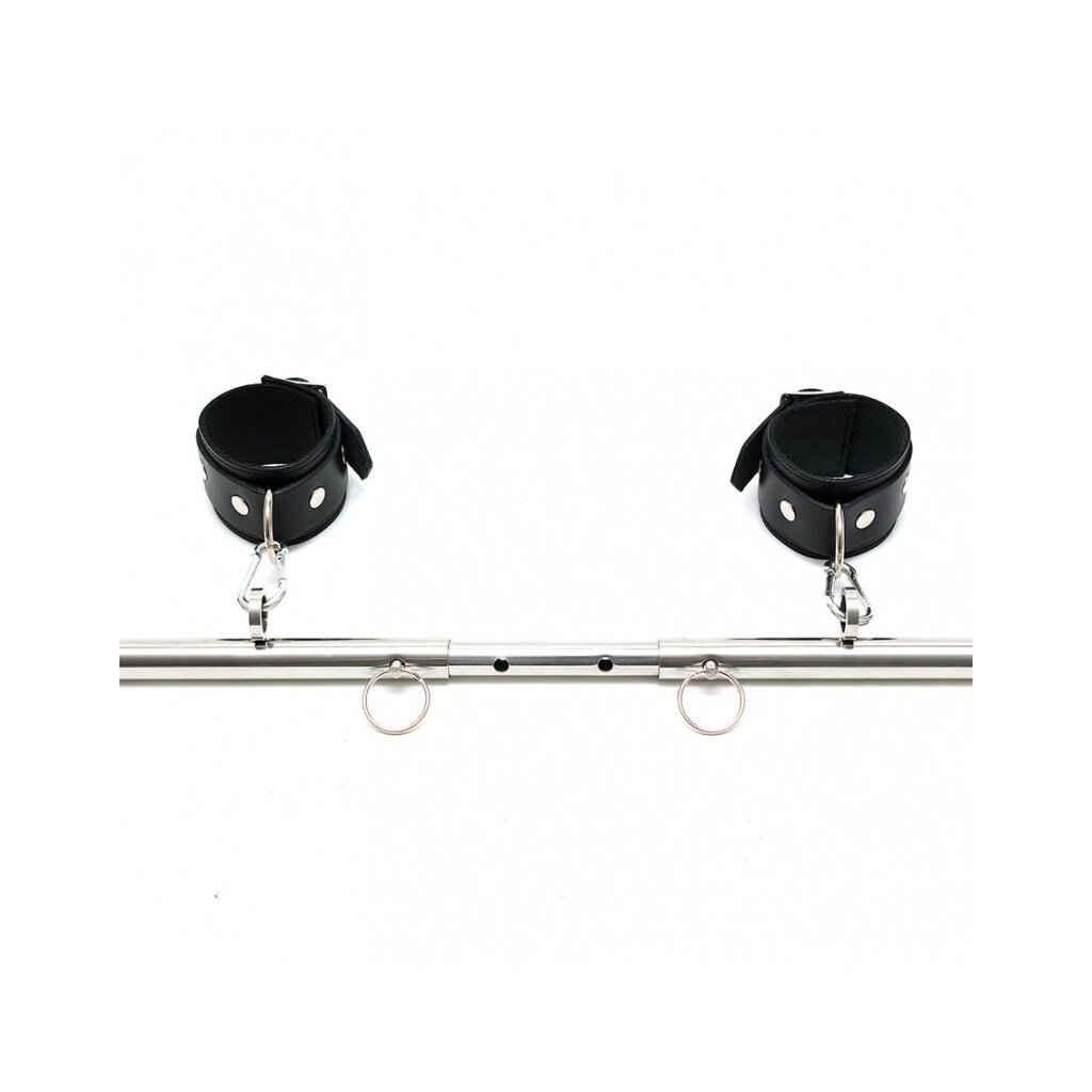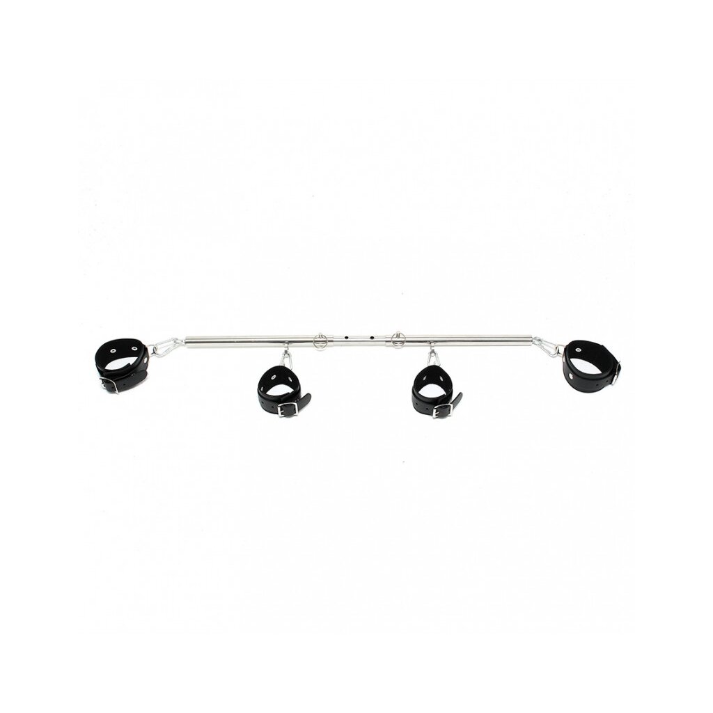 The Rimba 4 Cuffs with Adjustable Spreader Bar is a premium restraint system for thrilling bondage play. The sturdy metal bar adjusts through 8 locking positions between 55 and 85 cm, allowing you to control the level of spread and restraint. Four genuine saddle leather cuffs (two for wrists, two for ankles) are included and connect securely to the bar’s four built-in rings using durable carabiner hooks. The combination of leather and metal provides both security and visual appeal, perfect for controlled, dominant scenarios or creative positioning. The spreader bar can also be purchased separately for those who want to customize or expand their bondage gear.