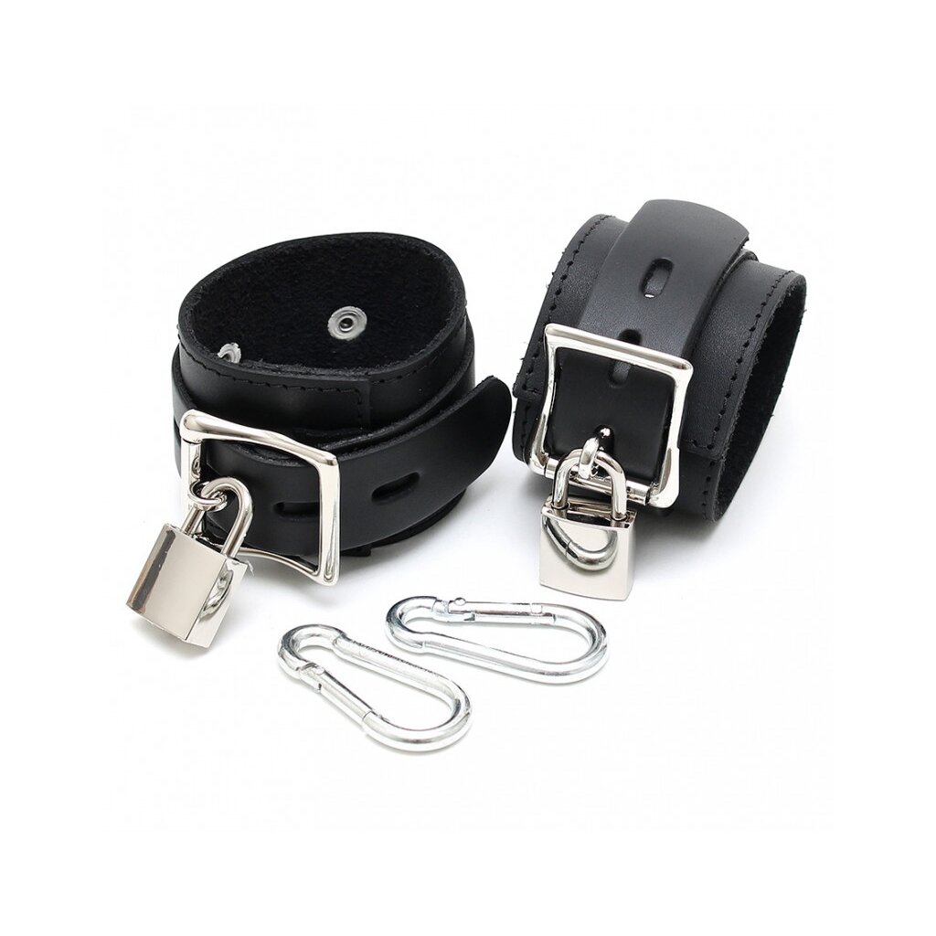The two carabiners allow you to connect the cuffs together or attach them to other bondage points, giving you complete freedom to shape the scene—whether tightly bound, widely spaced or anchored to a fixed position. The smooth leather adds a sophisticated touch, offering both comfort and a striking visual presence. Ideal for those who appreciate elegant, high-quality restraint with a deeply immersive erotic atmosphere.
