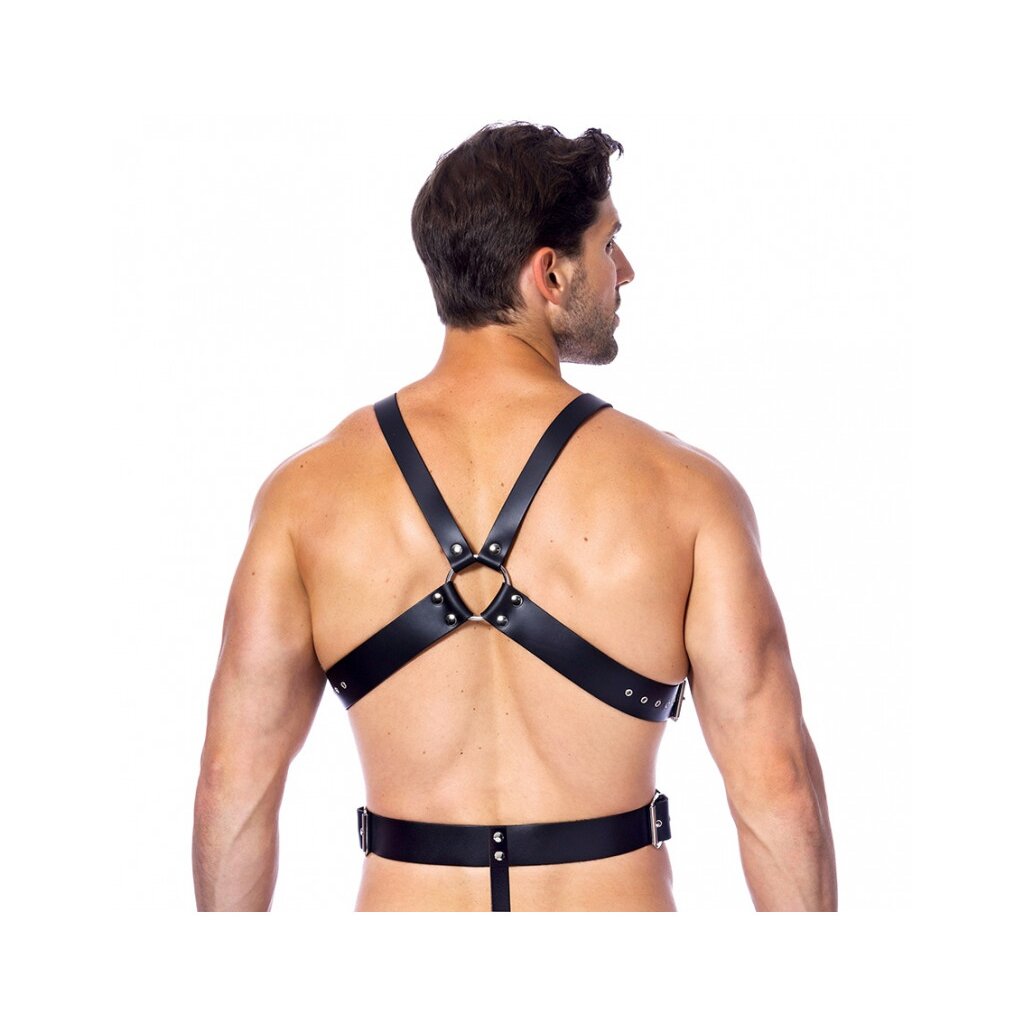 Körpergeschirr aus echtem Sattelleder mit zwei Penisringen mit einem Durchmesser von 40 und 50 mm, die mit Druckknöpfen befestigt werden, und einem Kreuzmuster auf der Rückseite.