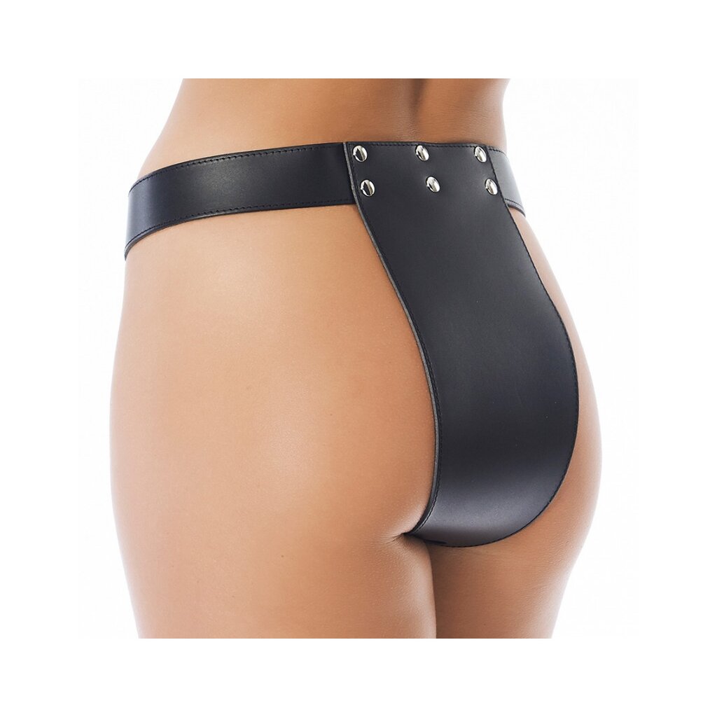 Ce slip de chasteté signé Rimba est une création entre rigueur et provocation. Confectionné en cuir de selle noir, il entoure les hanches avec fermeté tout en dévoilant l’essentiel à travers deux ouvertures franches à l’entrejambe.