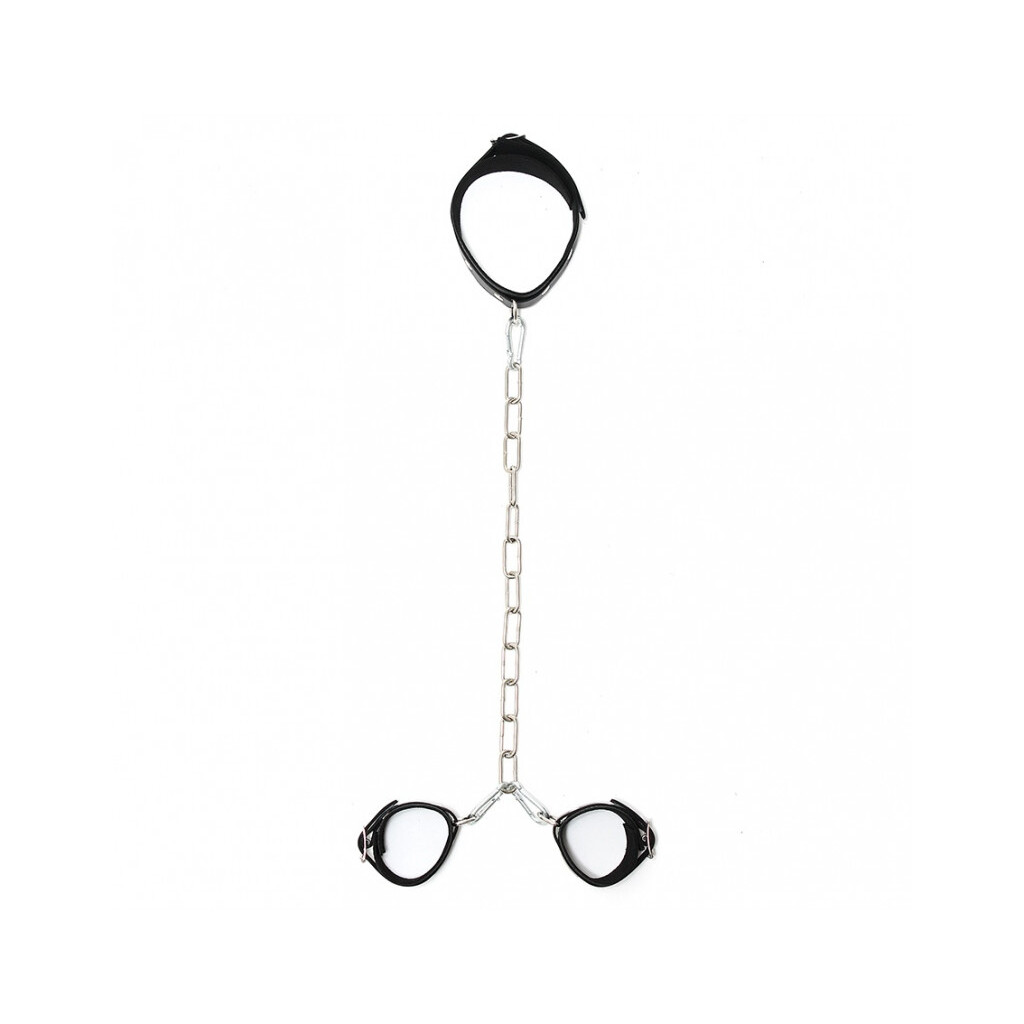 Die Rimba Hals- und Handfesseln-Kombination aus echtem Sattelleder ist ein luxuriöses Bondage-Set, das Dominanz und Eleganz perfekt vereint. Der kräftige Lederkragen und die passenden Handfesseln sind über eine stabile Metallkette miteinander verbunden und lassen sich mit den beiliegenden Karabinerhaken individuell anordnen oder abnehmen.