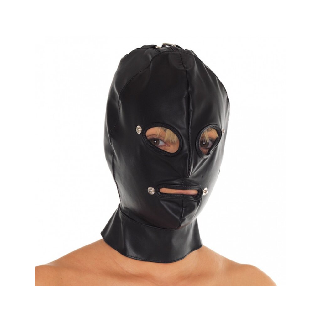 Rimba Bondage Play echtes Rindsleder. Kapuze mit abnehmbarem Blinkern und Mundstück, die durch Druckknöpfe gefestigt werden. Diese Haube schließt mit Reißverschluss und Schnur an der Rückseite und zwei Metallschnallen in den Hals. One Size / Material: Leder