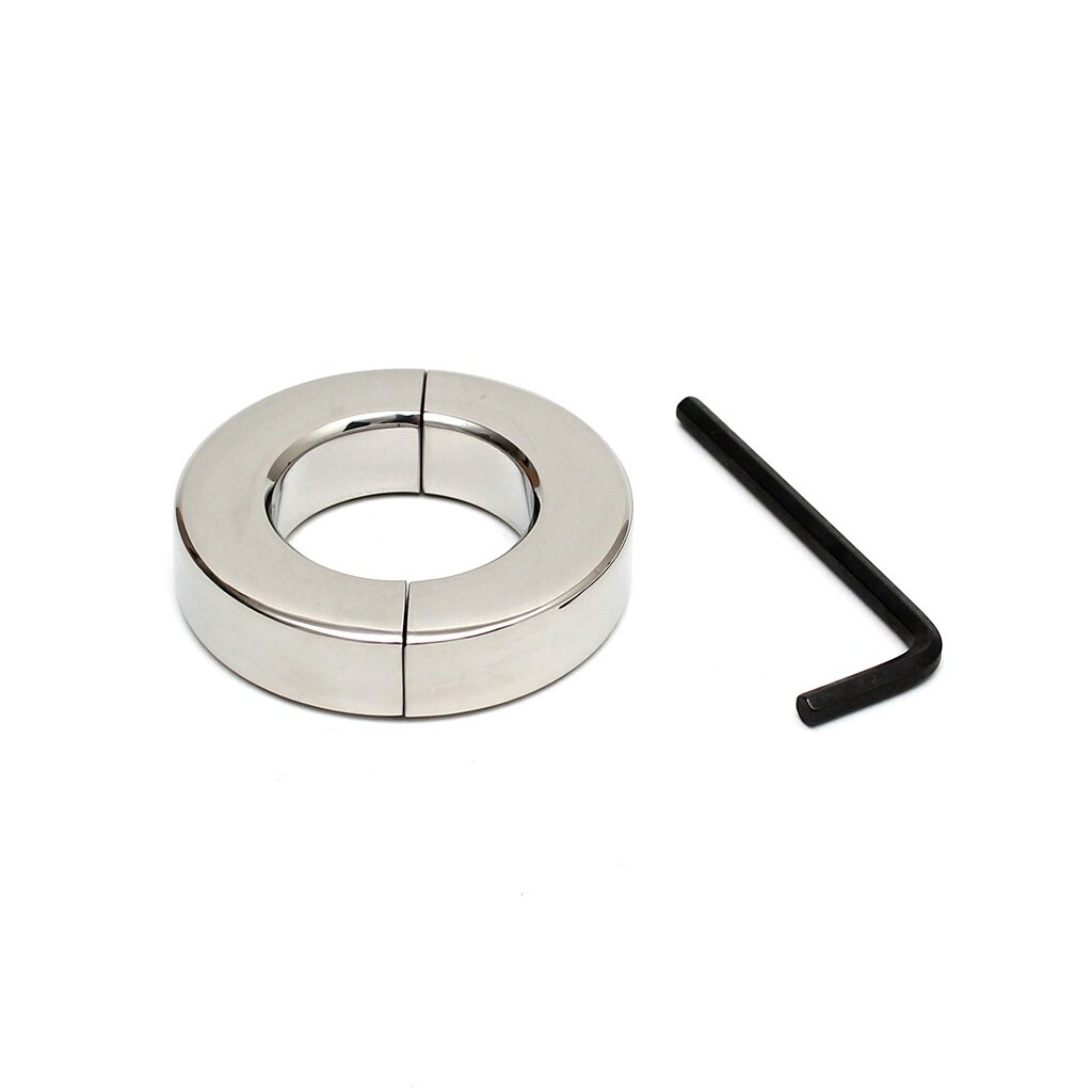 This two-piece design allows the stretcher to be placed directly around the scrotum before being tightened securely using the included Allen key. With an inner opening of Ø 3.2–3.5 cm and a height of 1.5 cm, it delivers a steady, pleasurable stretch and an erotic feeling of heaviness.