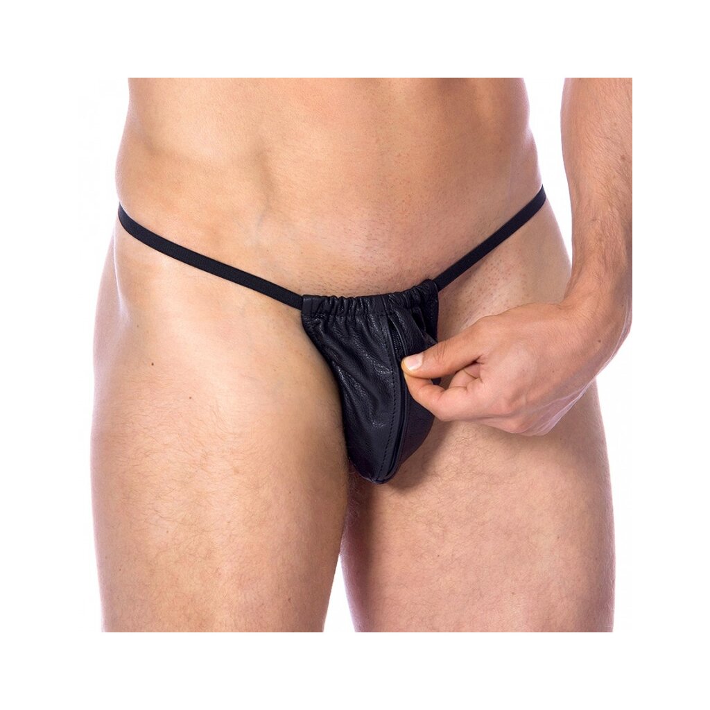 Ce G-string masculin en cuir nappa signé Rimba séduit par son design provocateur et sa fermeture éclair frontale.