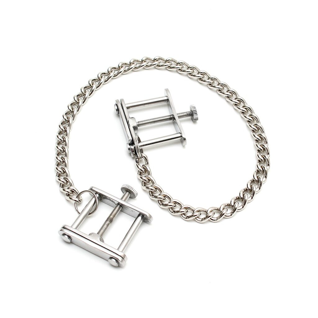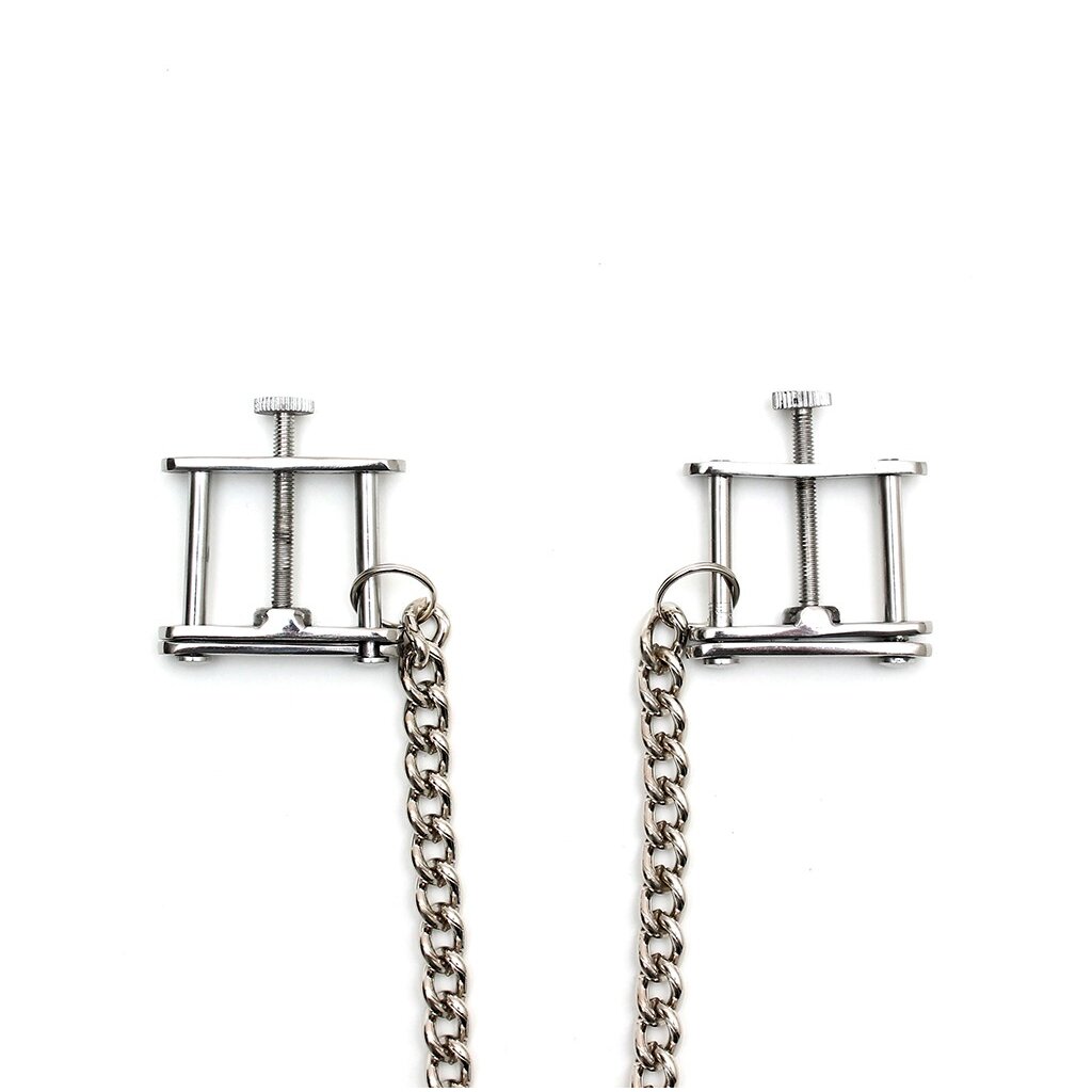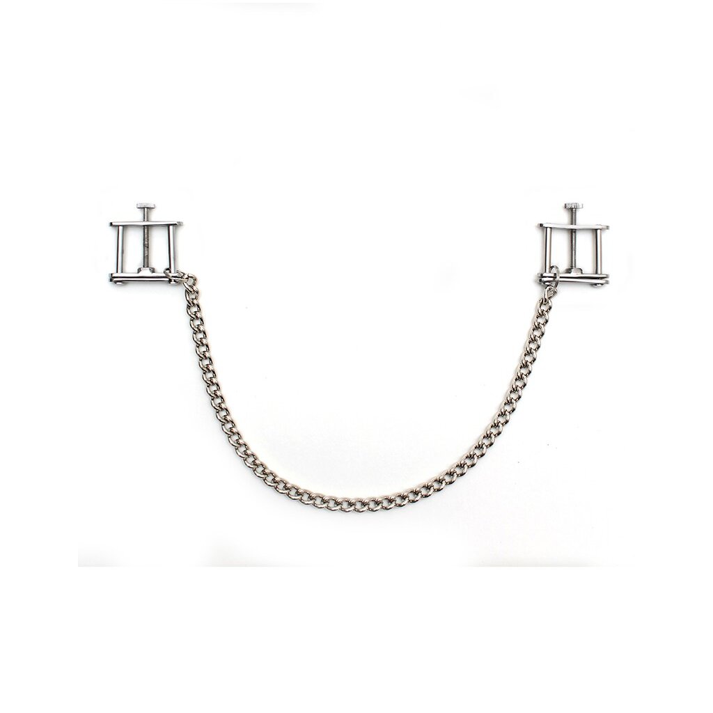 Die Rimba Brustklammern mit Kette in Silber vereinen Eleganz, Kontrolle und sinnliche Spannung. Mit ihrer verstellbaren Schraubfunktion kannst Du den Druck exakt an Dein Empfinden anpassen – von sanft stimulierend bis hin zu intensiv und fordernd. Die beiden Klemmen sind durch eine silberne Metallkette verbunden, die bei jeder Bewegung sanft schwingt und das prickelnde Gefühl von Kontrolle und Hingabe noch verstärkt.