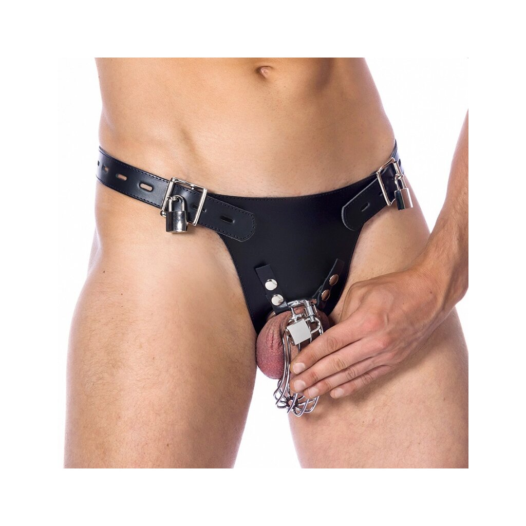 The harness features an opening for the penis and testicles. The solid metal cage locks securely with a padlock on top, ensuring complete restraint. The metal ring (Ø 4.6 cm) guides both penis and testicles through and can be detached from the leather harness if desired. The cage itself has an inner diameter of 3.7 cm and a total length between 9.5 and 14.5 cm for a snug yet comfortable fit.