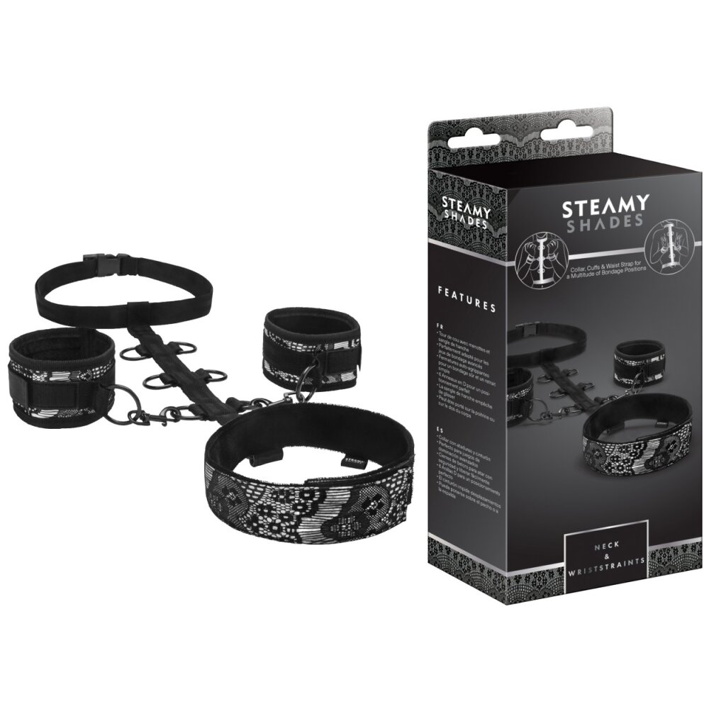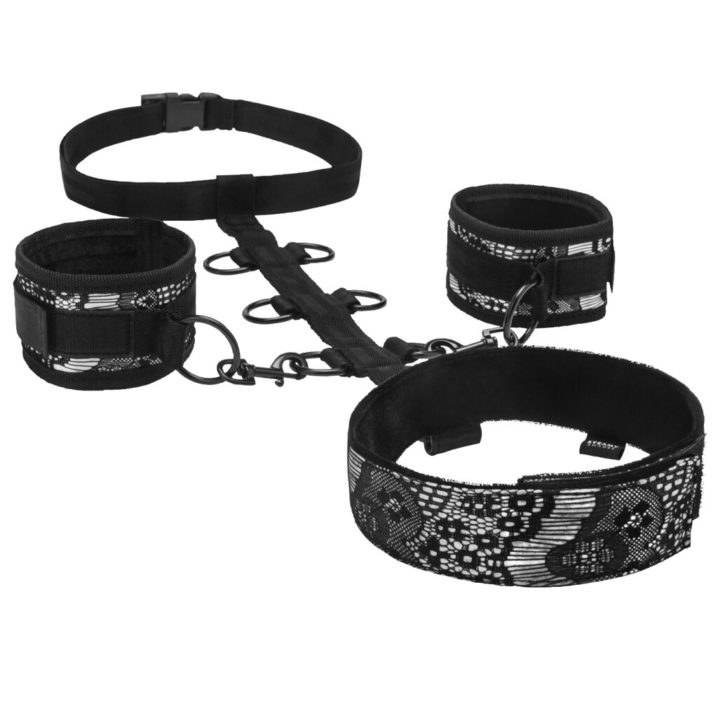Halsband mit Manschetten und Hüftgurt, perfekt für fortgeschrittene Fesselspielchen, Klettverschlüsse für sichere Fesselung und einfache Entfernung, 6 D-Ringe für die perfekte Positionierung, Hüftgurt verhindert ein Verrutschen, kann auf Brust oder auf dem Rücken des Körpers getragen werden. One Size / Materialzusammensetzung: Halsband & Manschetten (100% Polyester); Riemen & Hüftgurt (100% Polypropylen); Niete, Ringe, D-Ringe & Karabiner (100% nickelfreies Eisen); Verbindungsstück am Halsband (100% Polyurethan); Verschluss (100% ABS-Kunststoff)