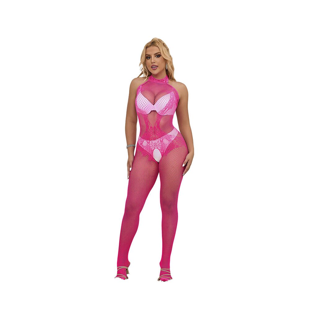 SUBBLIME Fishnet And Lace Crotchless Bodystocking With High Neck Pink One Size