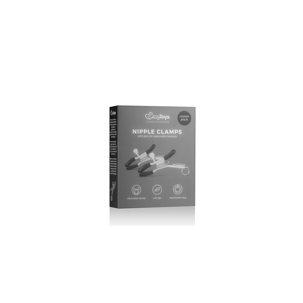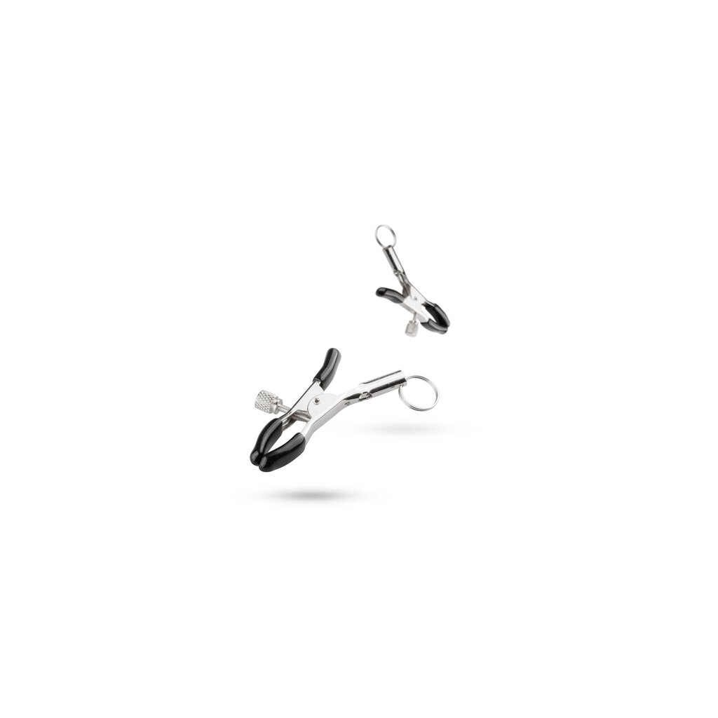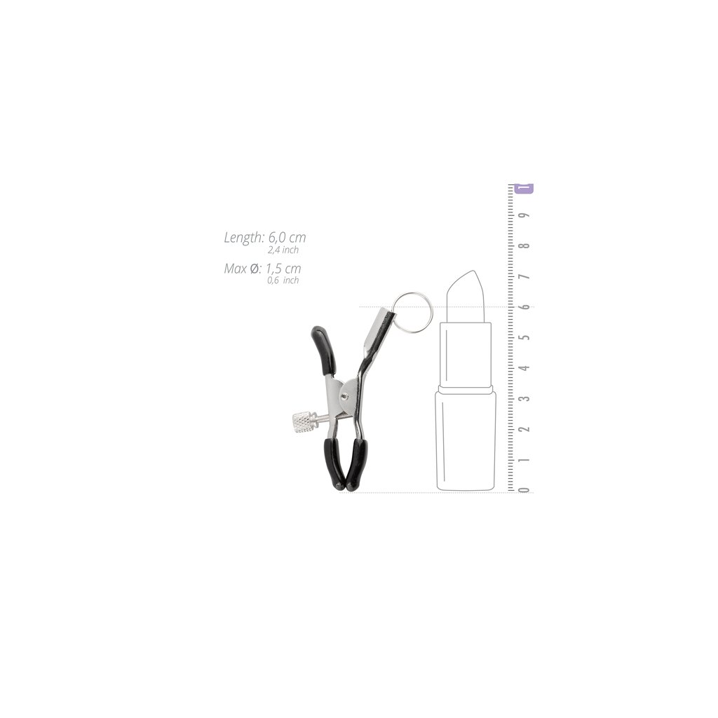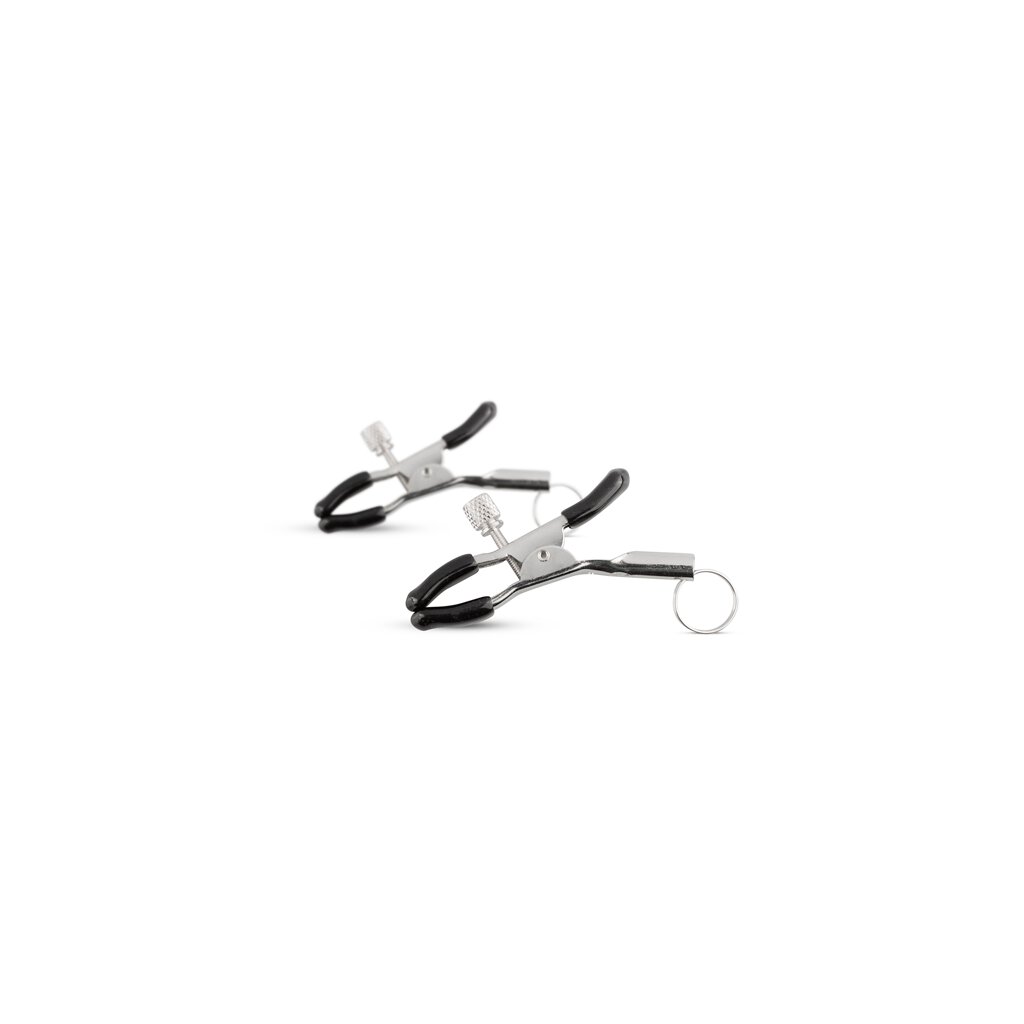 Choisissez votre propre pression avec ces pinces à tétons en métal de la collection EasyToys. Les pinces sont petites, solides et durables, et conviennent bien sûr aux hommes et aux femmes. Utilisez la vis sur les côtés des pinces pour régler la pression et l'intensité des pinces. Les capuchons de protection situés aux extrémités empêchent les pinces de glisser et de rayer la peau. Les pinces ont un petit anneau métallique en bas, que vous pouvez utiliser pour attacher les pinces à une chaîne de bondage par exemple.