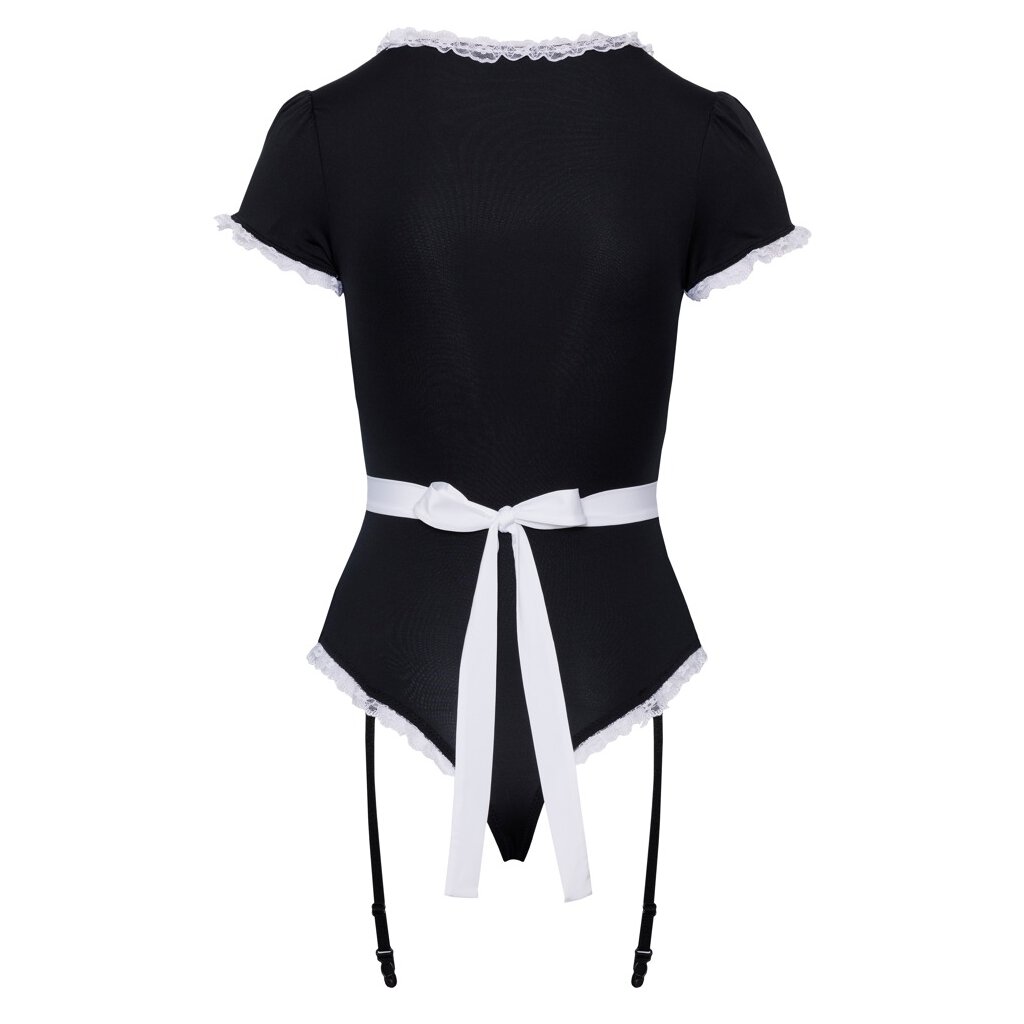 Hosenträger-Riobody inklusive Schürze als Kellnerin-Kostüm von Cottelli COSTUMES. Elastisch weicher Body in Schwarz mit stilvollen weißen Spitzenrüschen am großzügigen Ausschnitt, den halben Ärmeln und den hohen Beinausschnitten. 2 kleine weiße Zierknöpfe vorne vervollständigen den typischen Servier-Look. Im Schritt mit praktischem Druckknopfverschluss. Die verstellbaren Hosenträger sind abnehmbar. Die beiliegende weiße Schürze mit Spitzenvolant kann im Rücken gebunden werden.