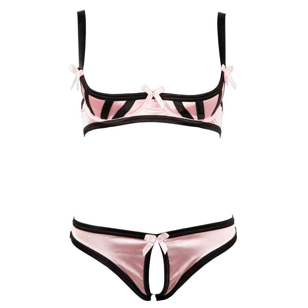 Ensemble de satin rose avec des détails noirs. Soutien-gorge à armatures avec bonnets légèrement rembourrés et bretelles réglables. Fermeture par crochet dans le dos. La culotte assortie incluse est sans entrejambe. 88% polyamide, 12% spandex. Sans bas.