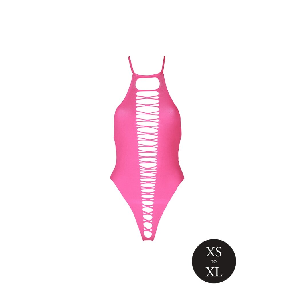 Dieser umwerfende Body hat einen auffälligen, leicht zu bindenden Neckholder und einen hohen Schnitt, der die Illusion einer schmaleren Taille und runderer Hüften erzeugt.