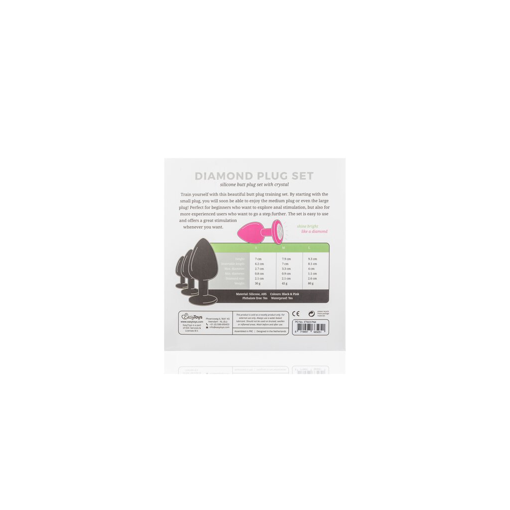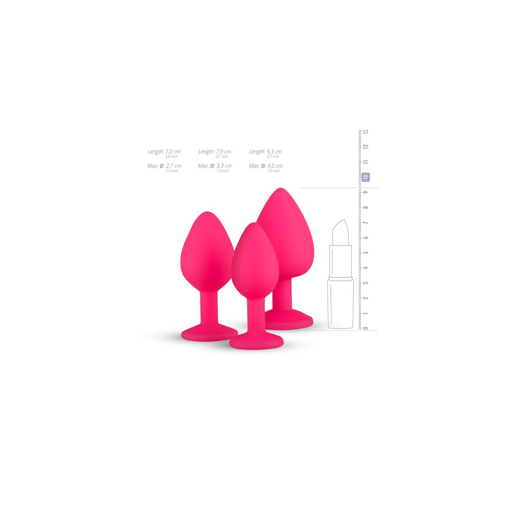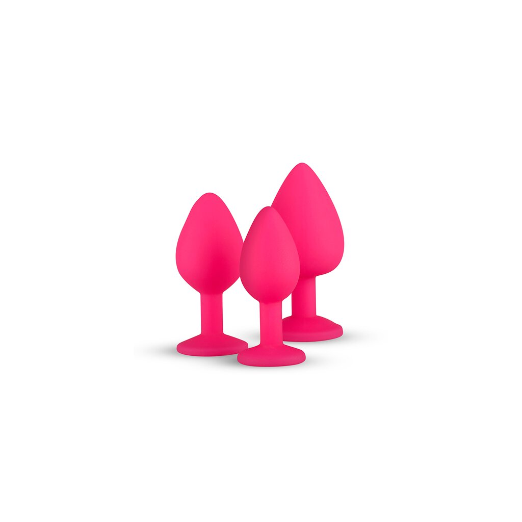 This 3-piece butt plug set is perfect for anyone who wants to discover anal stimulation. The butt plugs have different dimensions, so you can start small and go one step further at your own pace. The plugs are made of wonderfully soft, body-safe silicone for a comfortable use. The flat bottom of the plugs ensures safe use. The bottom also contains a beautiful stone, which gives the plugs a luxurious appearance.
