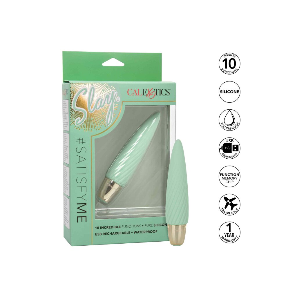 Slip the sensual Slay #SatisfyMe into your purse or handbag for knee-shaking pleasure wherever you go. The mini bullet massager fits between your fingers to let you deliver pinpoint tantalization and thrill with sensually ribbed vibrations. Get playful while you flicker through 10 indulgent vibration, pulsation and escalation functions with the easy-touch control button. Effortlessly control pure pleasure with an easy-touch silicone button and hold for 3 seconds to turn on or off.