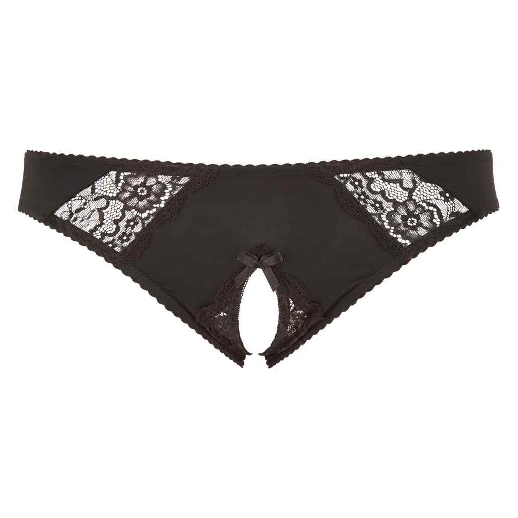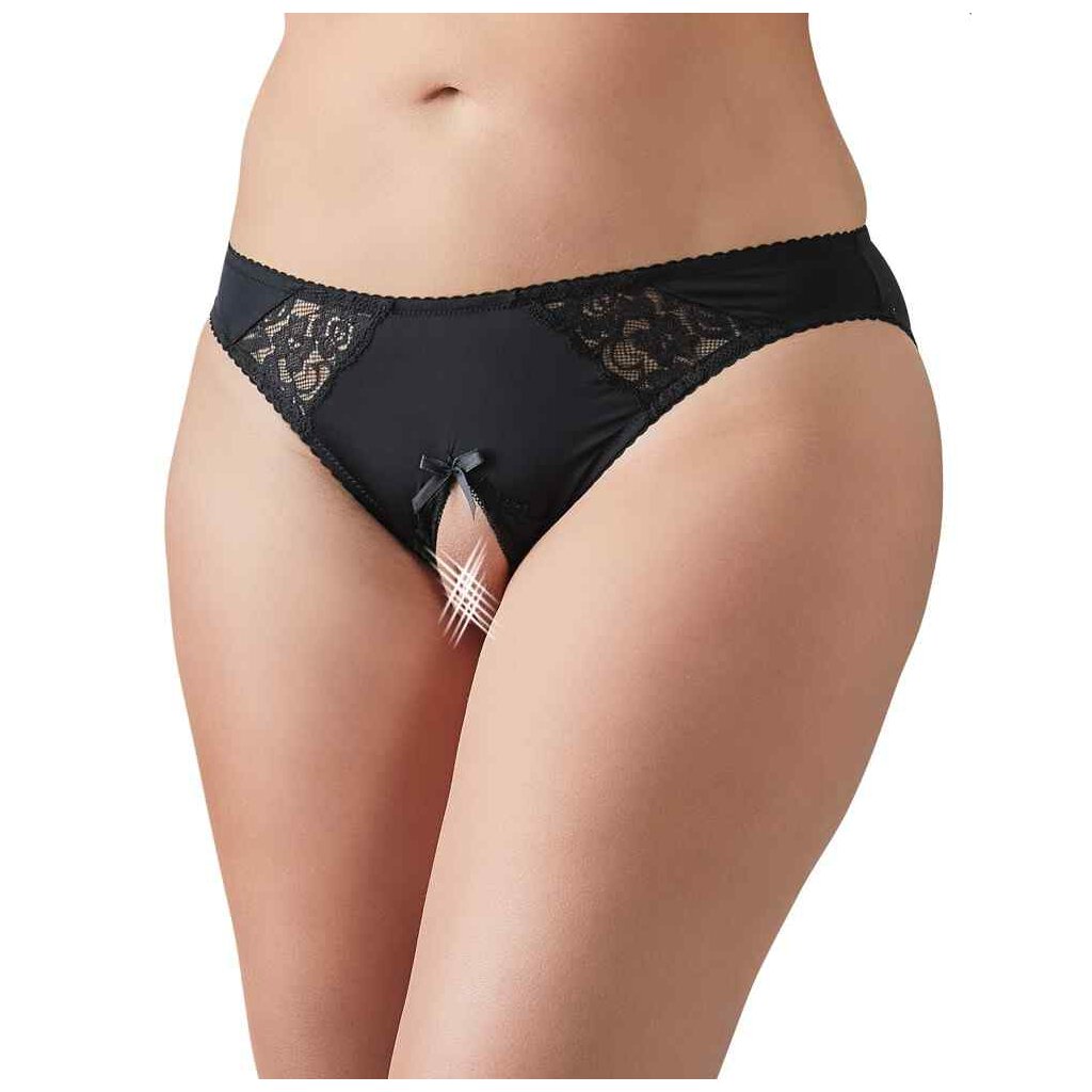 Absolut verführerisch! Passformsicherer Slip mit elastischen Spitzeneinsätzen vorne. Der einladend offene Schritt wird mit einer frechen Zierschleife akzentuiert.