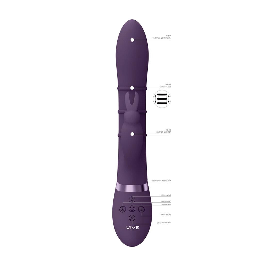 The high class VIVE brand stands for ultimate stimulation through continuous innovation! This top of the range G-spot Rabbit Vibrator boasts a unique feature that will make your toes curl in ecstasy! It has a set of 3 stimulating rings integrated into the smooth, medical grade, silicone shaft that moves up and down for an internal massage like no other. The rings come with 10 different speed modes, while the G-spot stimulator and the Rabbit stimulator both have 10 different vibration modes which give you a mind blowing 1,000 distinct settings to choose from. The VIVE054 is IPX7 waterproof/submersible and rechargeable. A 150 minutes charge will give you 45 minutes of unbridled pleasure at less than 60dB. Furthermore, this unique and Innovative vibrator has a one touch travel lock & climax button, when you are ready to orgasm, just press the climax button and with one touch all motors go to its strongest setting.