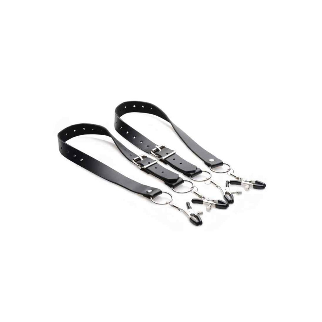 Avec ces bandes uniques que vous pouvez enrouler autour de vos cuisses, les serrer sur vos lèvres et les écarter, vous aurez la possibilité d'augmenter l'intensité des scènes les plus perverses ! Parfait pour les jeux d'humiliation, les jeux de rôle gynécologiques ou tout ce que vous souhaitez réaliser, cet ensemble unique maintiendra les organes génitaux de vos partenaires ultra-sensibles et exposés à l'impuissance comme jamais auparavant. Les bandes sont doublées à l'intérieur avec une douceur veloutée et ont des boucles pour ajuster l'ajustement autour des cuisses. Les pinces avec embouts en caoutchouc sont munies de vis à pouce qui permettent de régler la pression. Soyez créatif avec vos scénarios BDSM !