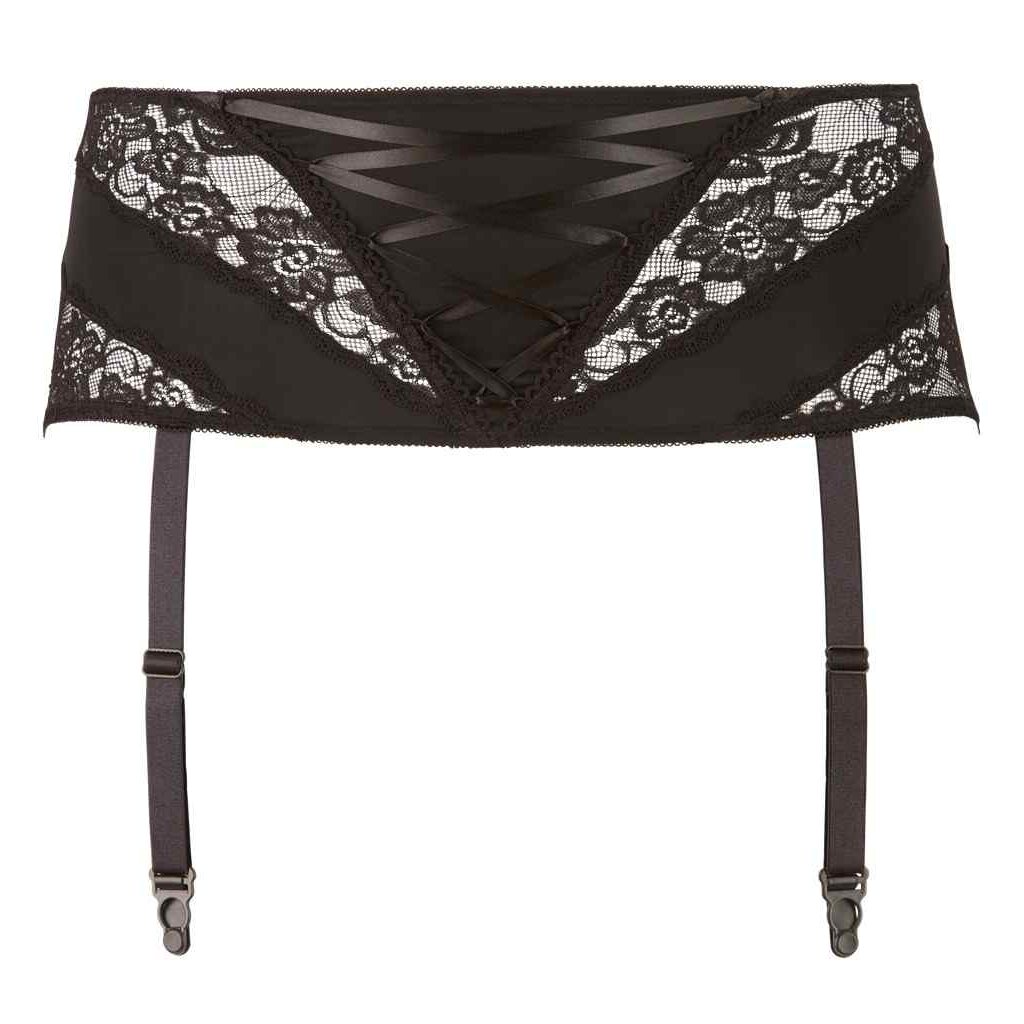 Dieser schwarze Strapsgürtel mit Spitzeneinsätzen und kleiner Schnürung in der Front ist das Highlight Ihres nächsten Verführ-Outfits. Vier verstellbare Strapshalter halten Ihre Strümpfe an Ort und Stelle. Mit Hakenverschluss im Rücken. 90% Polyamid, 10% Elasthan. Ohne Strümpfe.