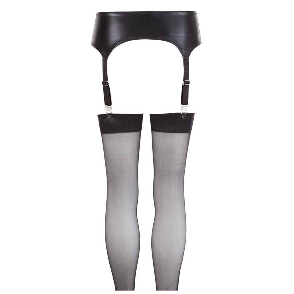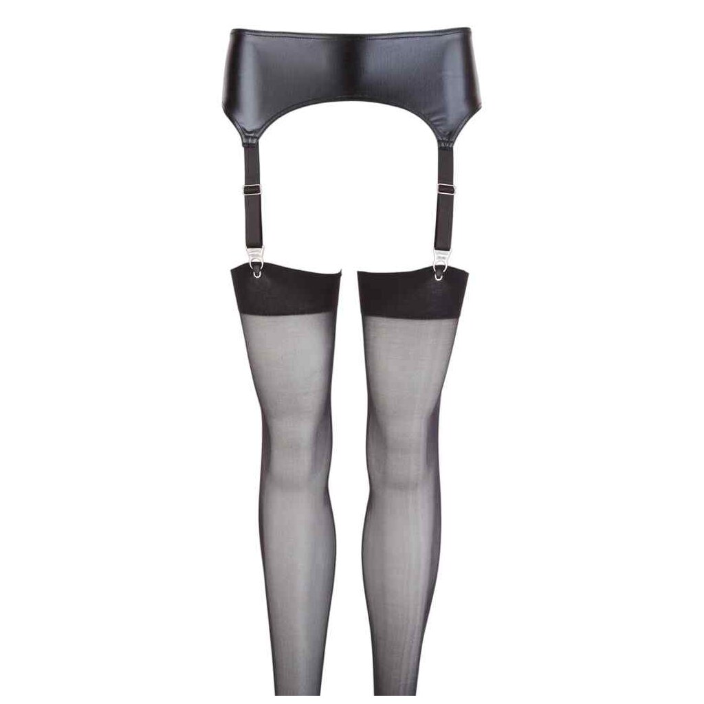 Black wet look suspender belt and matching stockings in a set. Belt: 92% polyester, 8% spandex. Stockings: 100% polyamide.