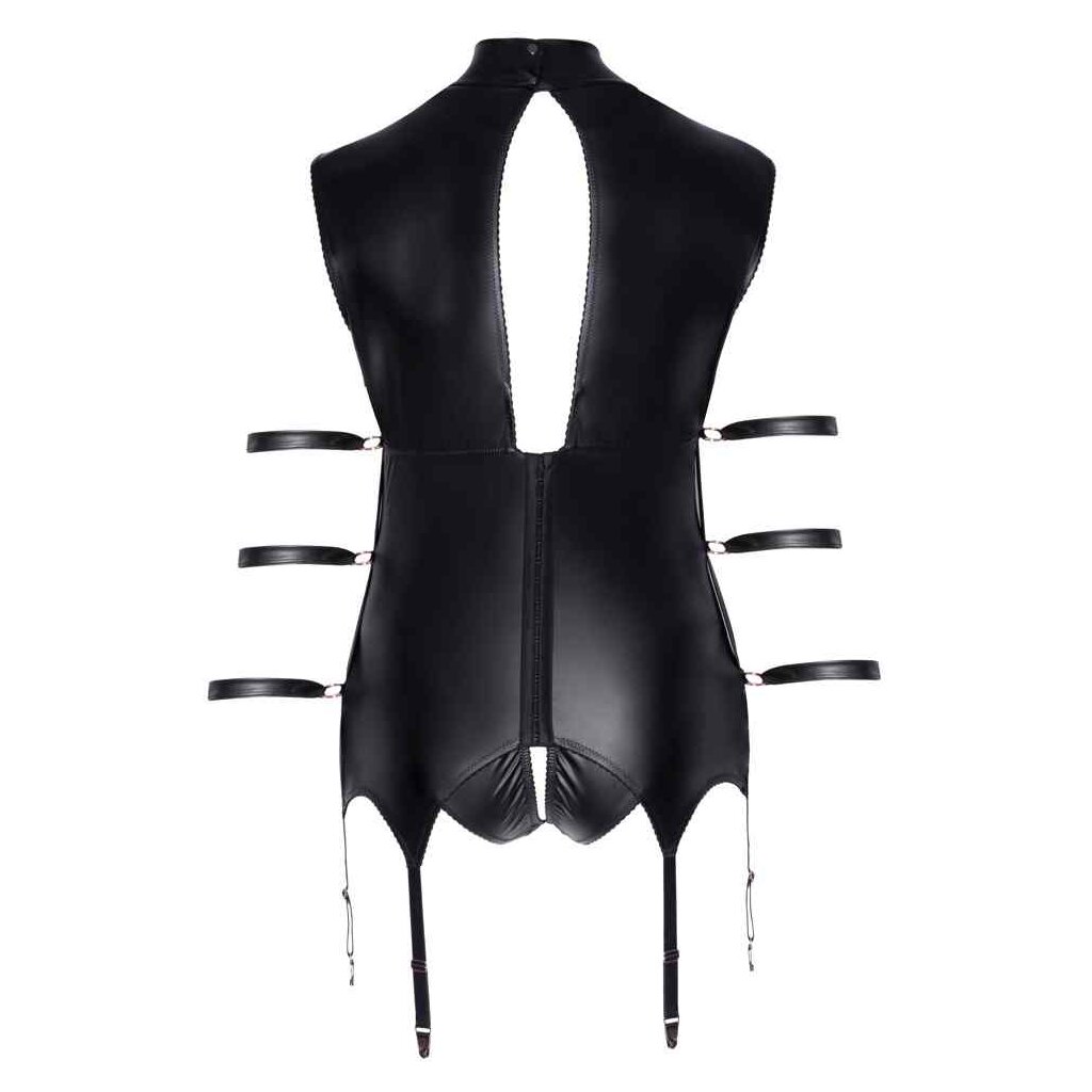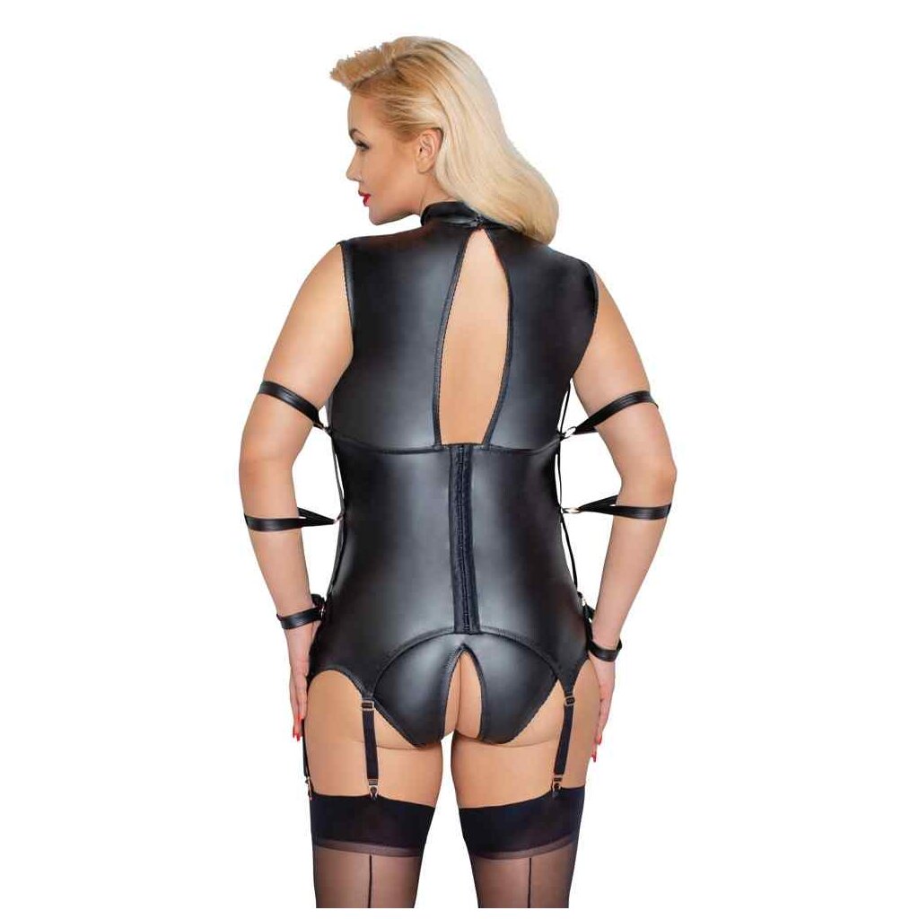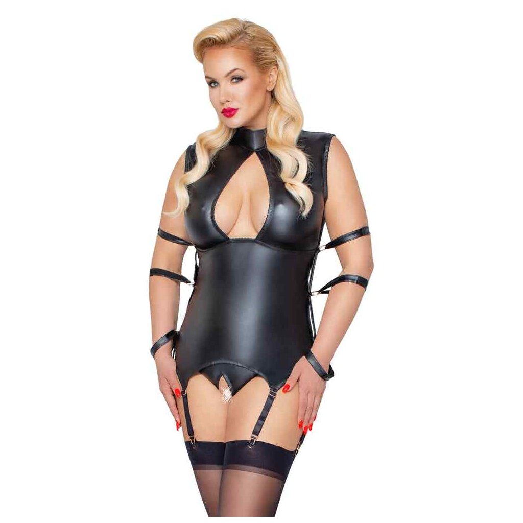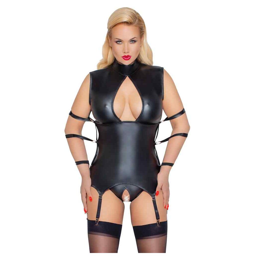 Sensational suspender shirt and slip ouvert by Cottelli BONDAGE in noble elastic matte look with rose gold-colored metal elements. Front and back with large neckline, stand-up collar with snap fastener. In the back with hook closure. Sophisticated are the 6 arm cuff straps with velcro for captivating gimmicks, which can be pulled through the bondage rings on the side. The 6 garter straps are adjustable. The briefs are open at the crotch to above the bottom.