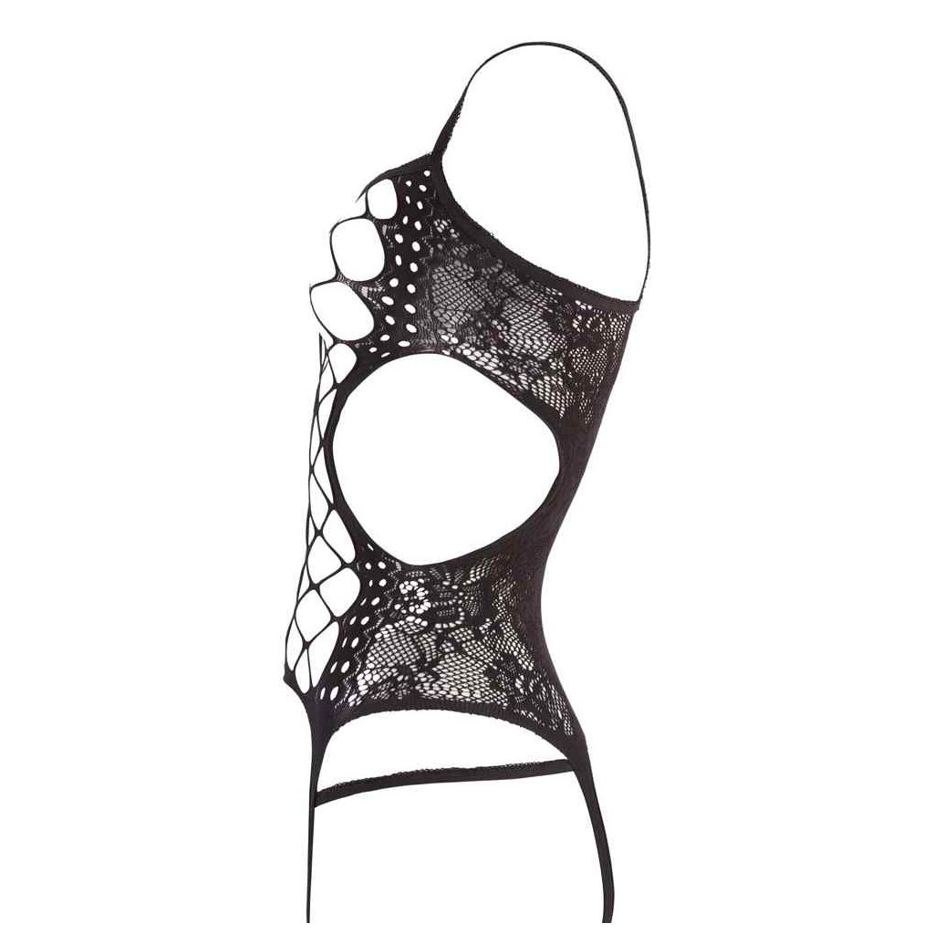 Strapshemd, Strapse und Strümpfe in Einem plus String! Loch- und Netzstruktur in Kombination mit Spitzenoptik. Sie Strümpfe sind direkt an das Strapshemd angewebt, der String ist inklusive. Schwarz. 90% Polyamid, 10% Elasthan.