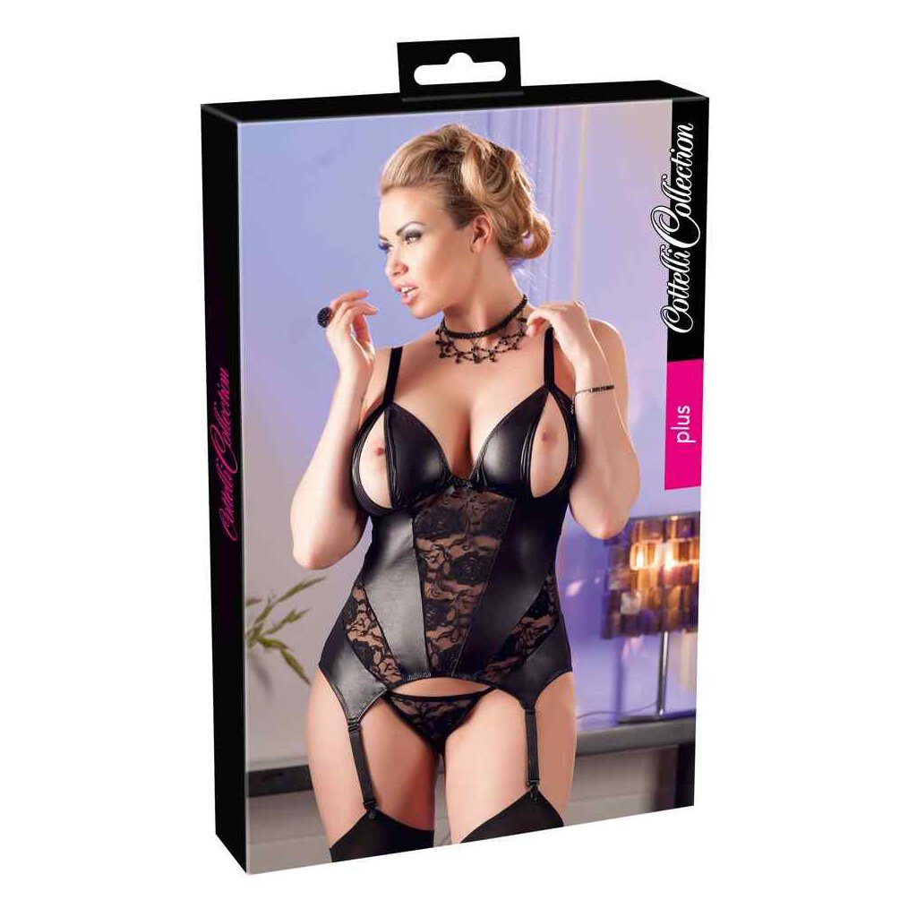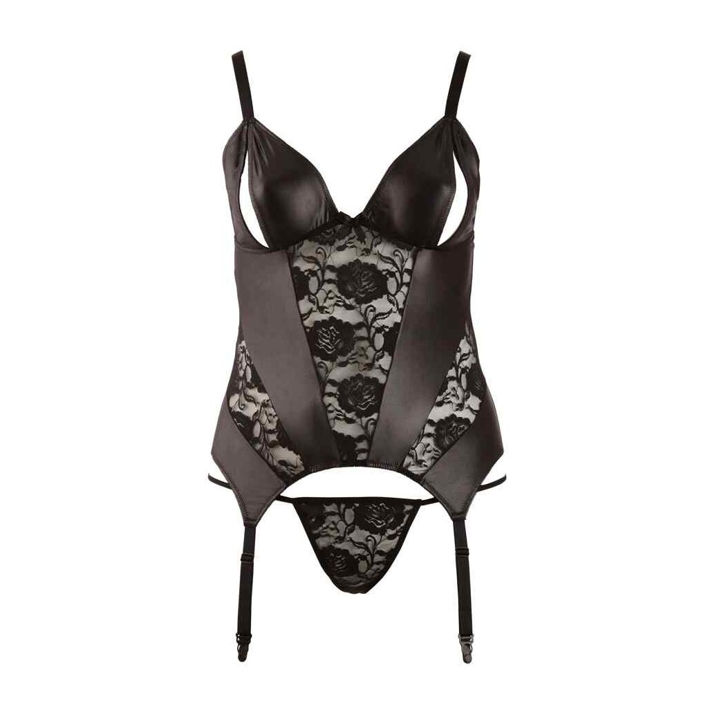 Black cami suspender with open cups and lace inserts. All straps are adjustable. Hook closure in the back. 60% polyamide, 30% polyester, 10% spandex. Lace G-string included: 90% polyamide, 10% spandex.