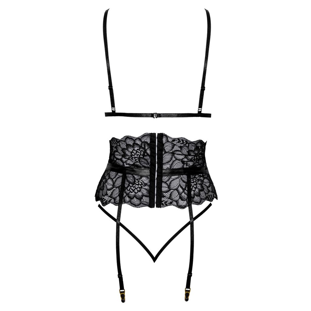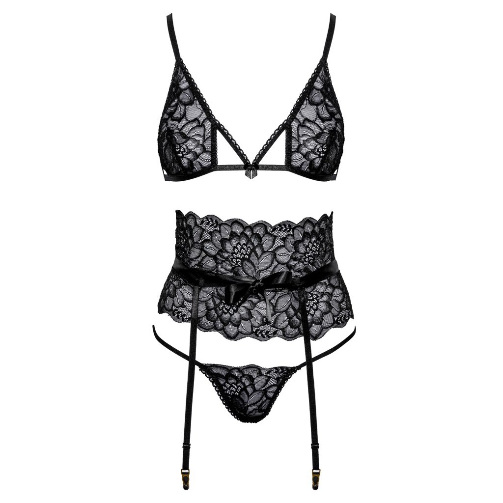 Soft bra, suspender belt & thong in an elegant set by kissable completely made of fine black lace. All around soft and elastic for highest wearing comfort. Stylish bra with hook closure in the back and matching adjustable straps. The waist accentuating suspender belt scores with satin ribbons that tie into a bow at the front. The hook closure in the back goes over the full width, the suspenders are suitably adjustable. The small thong seduces with its two narrow stretch straps that join at the crotch.