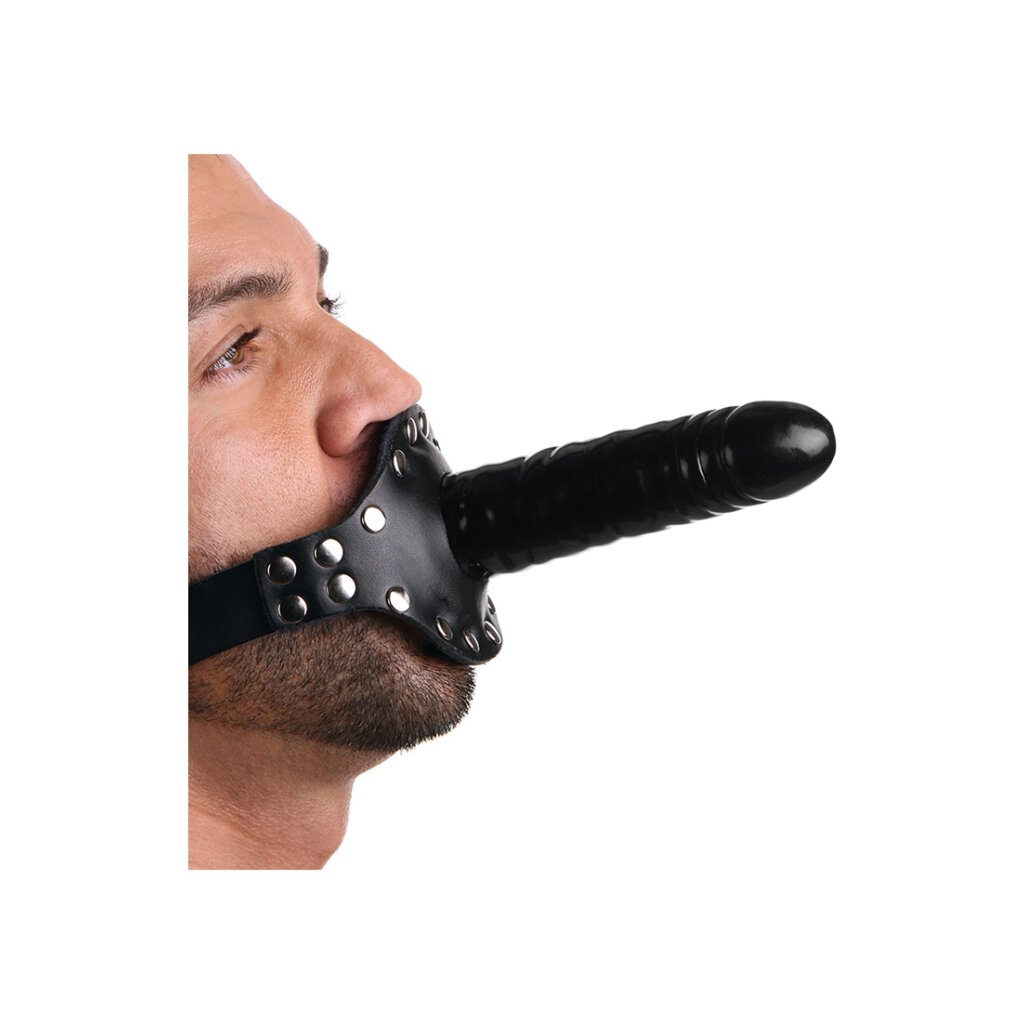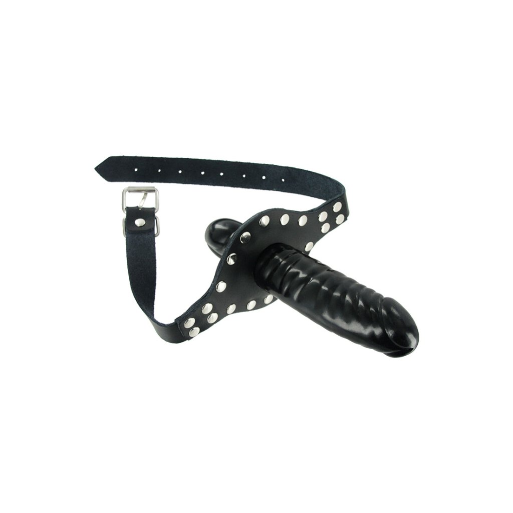 Cette double dose de bite est soutenue par une sangle en cuir robuste et ajustable qui s'attache derrière la tête et un protège-bouche orné de rivets.