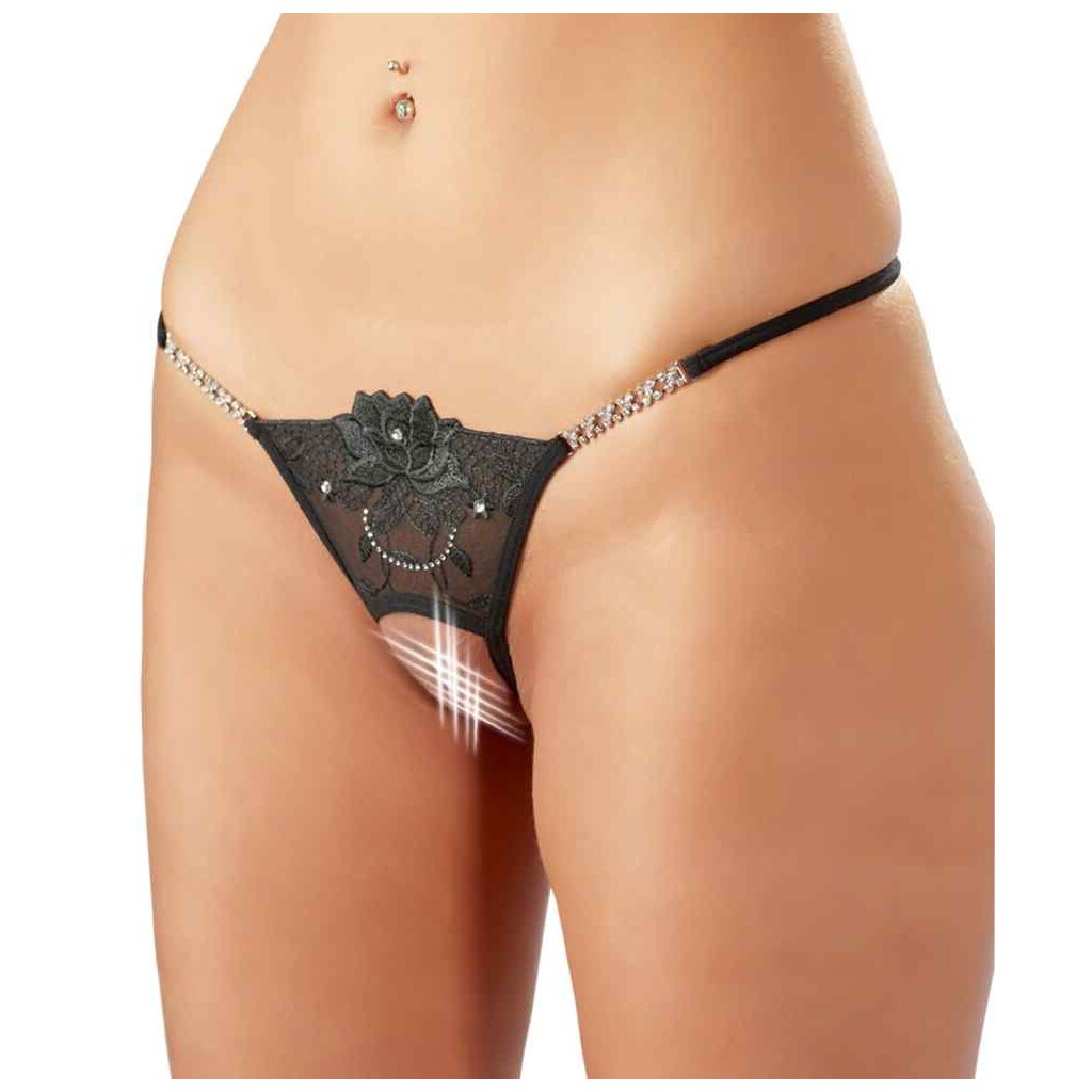 Tiny crotchless string with a seductive open crotch. With elaborate embroidery at the front and rhinestone decoration. With fancy decorative lacing above the buttocks.