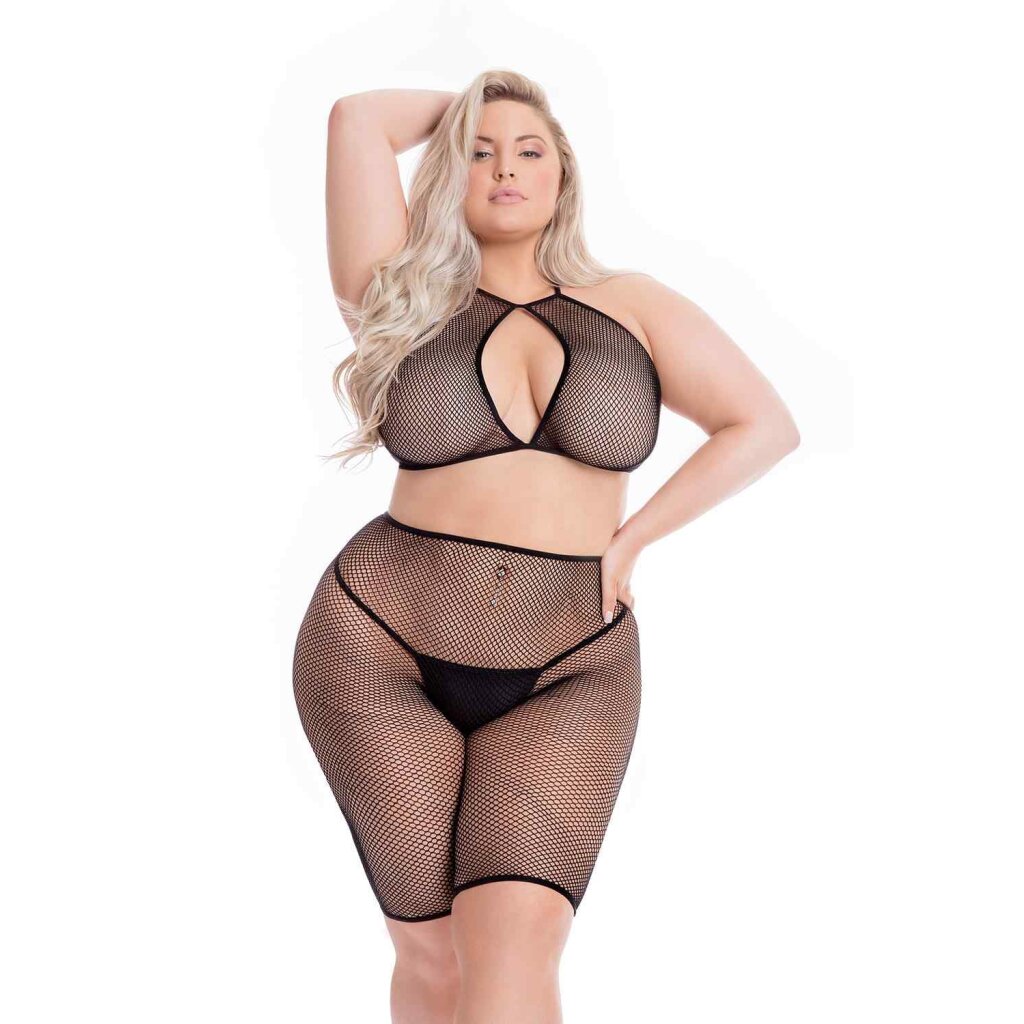 Ensemble composé d'un soutien-gorge tour de cou et d'un short de cyclisme. Le soutien-gorge et le short sont tous deux en filet. Lavable à la main. Quand la sportivité rencontre la séduction. Rendez hommage à votre côté sportif avec le set Sunset Glow Bike Short. Le soutien-gorge séduit par son grand design en forme de trou de serrure qui, associé à la matière résille transparente, laisse libre cours à l'imagination. En tant qu'ensemble audacieux d'inspiration sportive, vous pouvez vous attendre à beaucoup de confort, car le matériau se sent presque comme une seconde peau, car il épouse votre corps et souligne votre forme naturelle. Profitez de la polyvalence de cet ensemble en le portant seul pour offrir un plaisir visuel à votre partenaire ou en le combinant avec un soutien-gorge et un slip de votre choix. Plussize / Composition du matériau : 100% nylon
