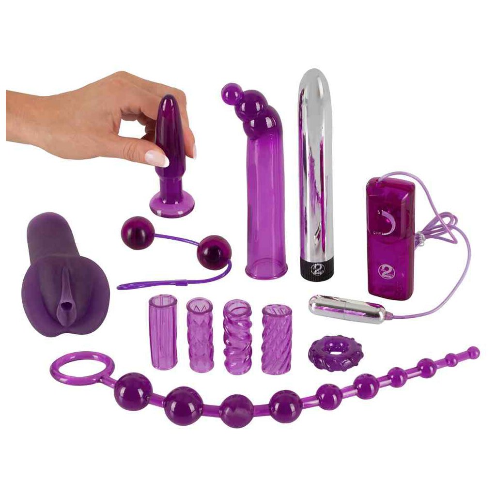 Coffret de sex toys de 12 pièces, idéal pour de nouveaux frissons et des jeux passionnants et riches en variété. Contenu : vibromasseur puissant (17 cm, Ø 2 à 2,6 cm), manchon de plaisir pour vibromasseur ou pénis, butt plug, masturbateur vaginal (pour des massages rythmés), perles anales, quatre menottes pour pénis, anneau de bite, duo de boules d'amour et une vibro-bulle. Matériau : ABS, TPE. Piles incluses.