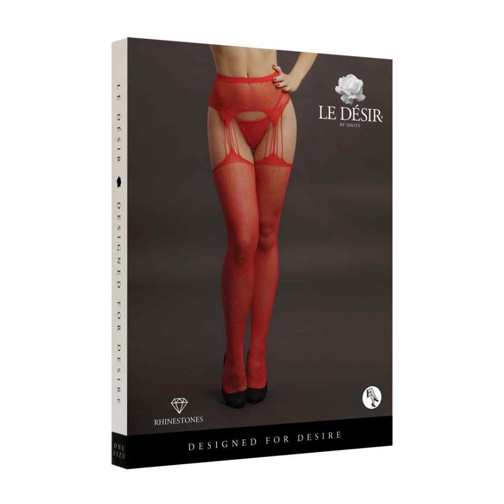 Suspender pantyhose made of soft, stretchy fishnet with rhinestones. Wear under clothing for a timely reveal, or to accessorise a lingerie set to amp up bedtime games. Thong not included.