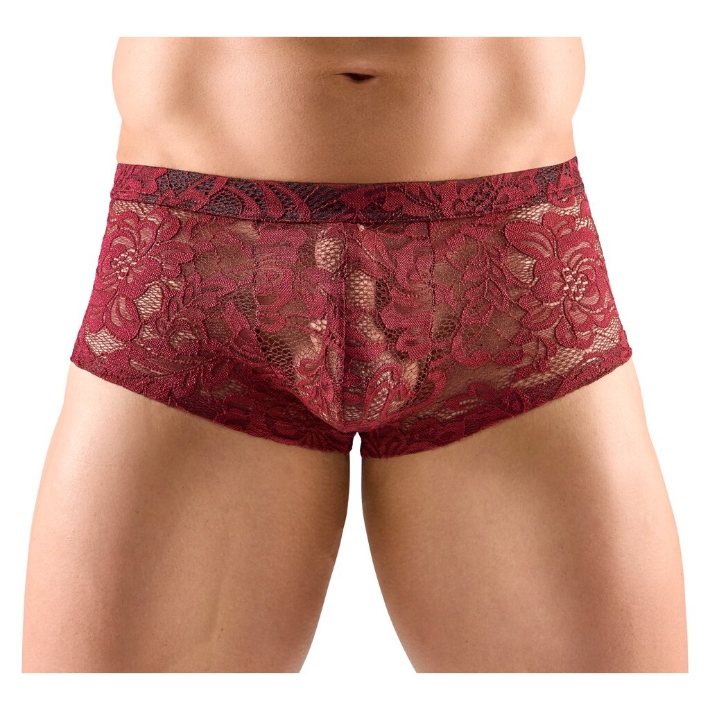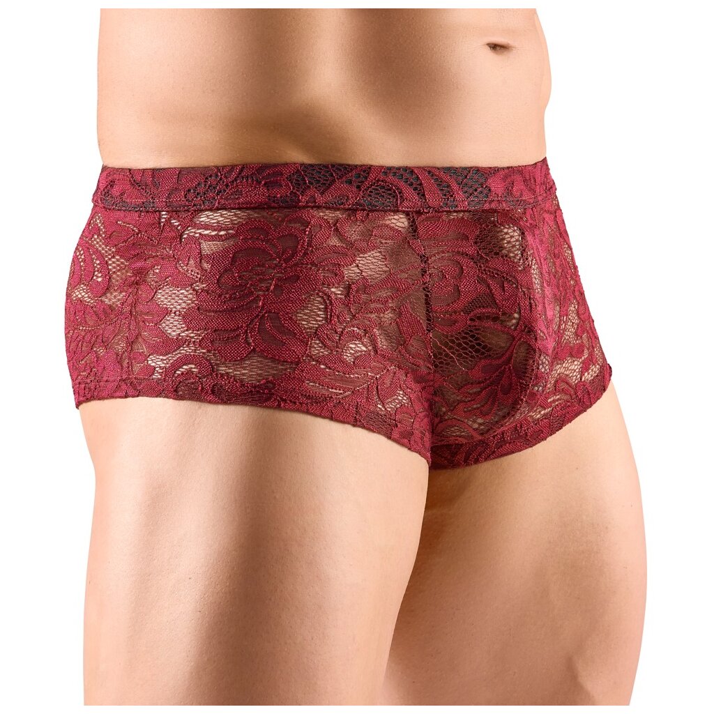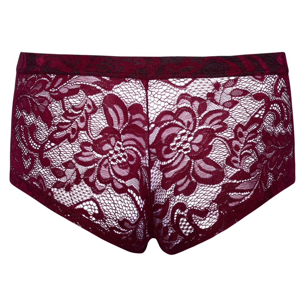 Discover the transparent pants with a lace look from Svenjoyment! These emphasized pants made of dark red floral lace