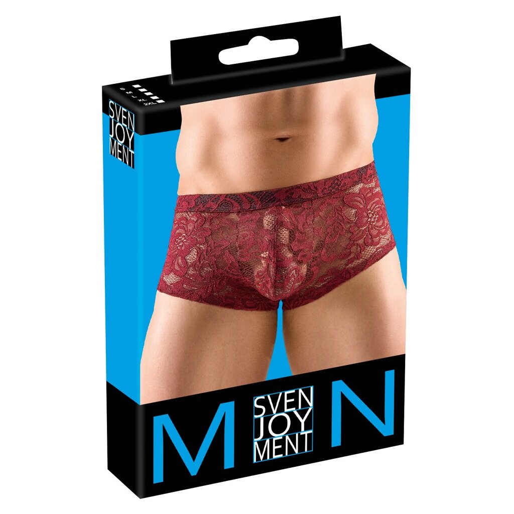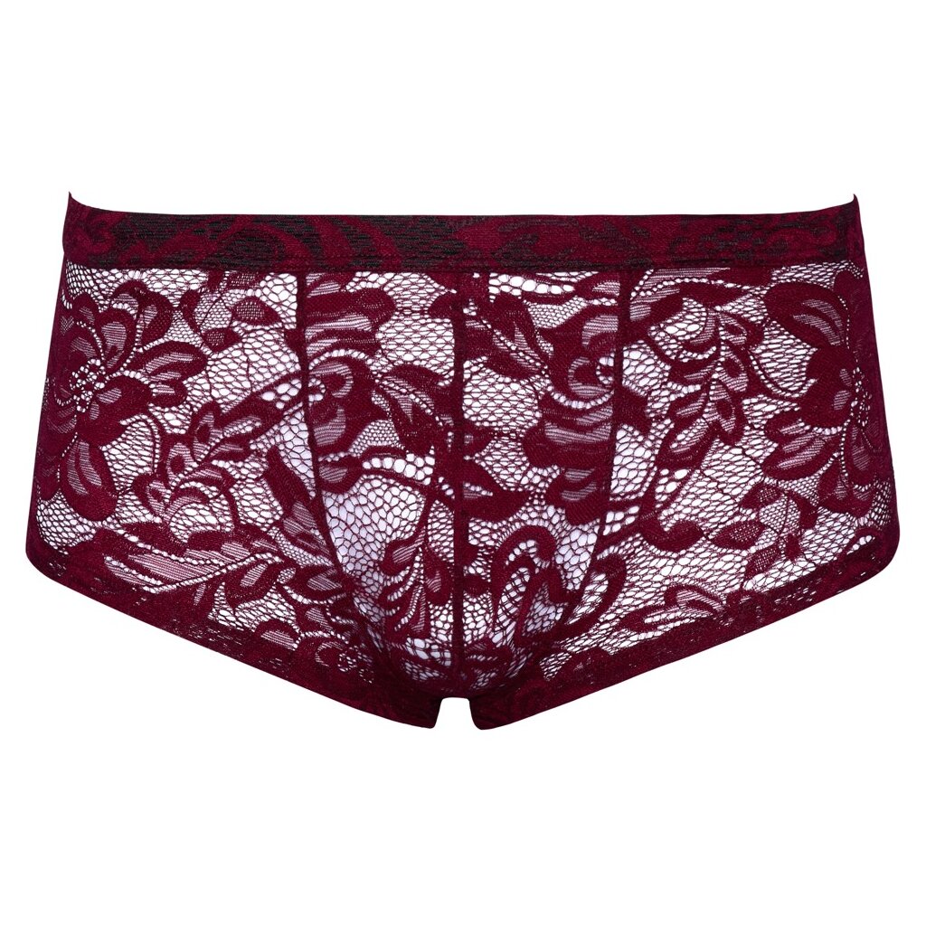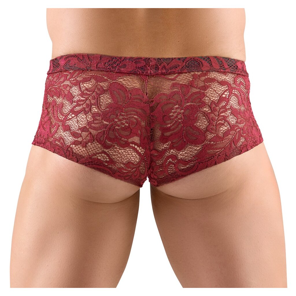 Discover the transparent pants with a lace look from Svenjoyment! These emphasized pants made of dark red floral lace
