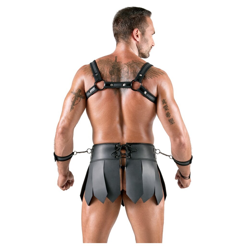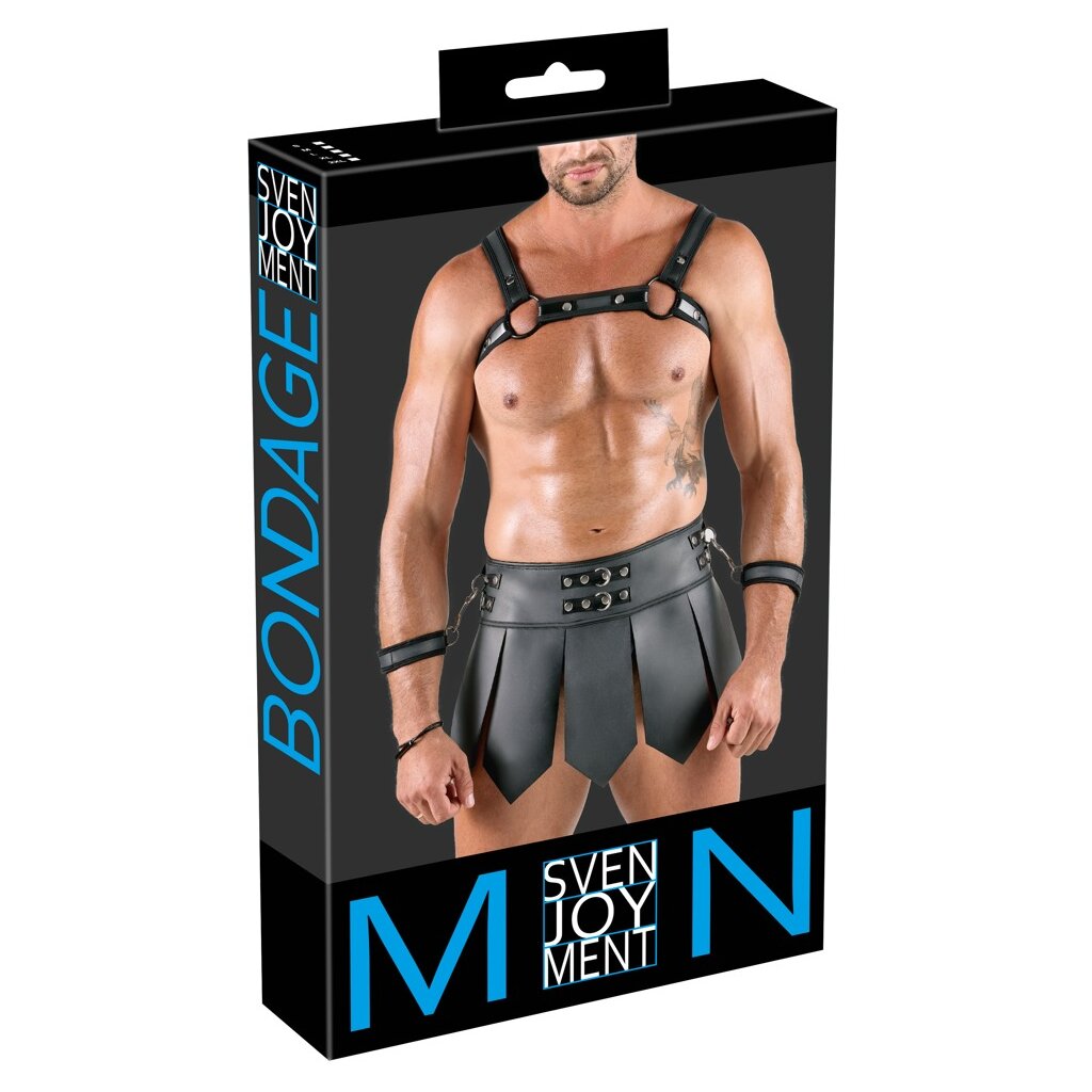 Brustgeschirr, Gladiatorrock und 2 Handschellen im Set von Svenjoyment Bondage. Mattschwarzes, auffälliges Material – leicht elastisch für hohen Tragekomfort. Geschirr mit praktischen Druckknöpfen zum schnellen An- und Ausziehen. Kurzer Rock mit stylischer Schnürung am Rücken. Riemen mit Nieten und Ringen an der Vorderseite und den Seiten des Bunds. Die beiden mitgelieferten Handschellen lassen sich mit ihren Doppelkarabinern schnell befestigen. Die weichen Fesseln lassen sich dank Klettverschlüssen schnell anlegen und für lustvolle Fesselspiele anpassen.