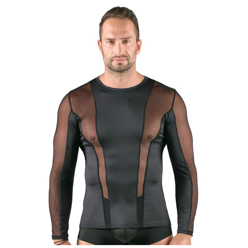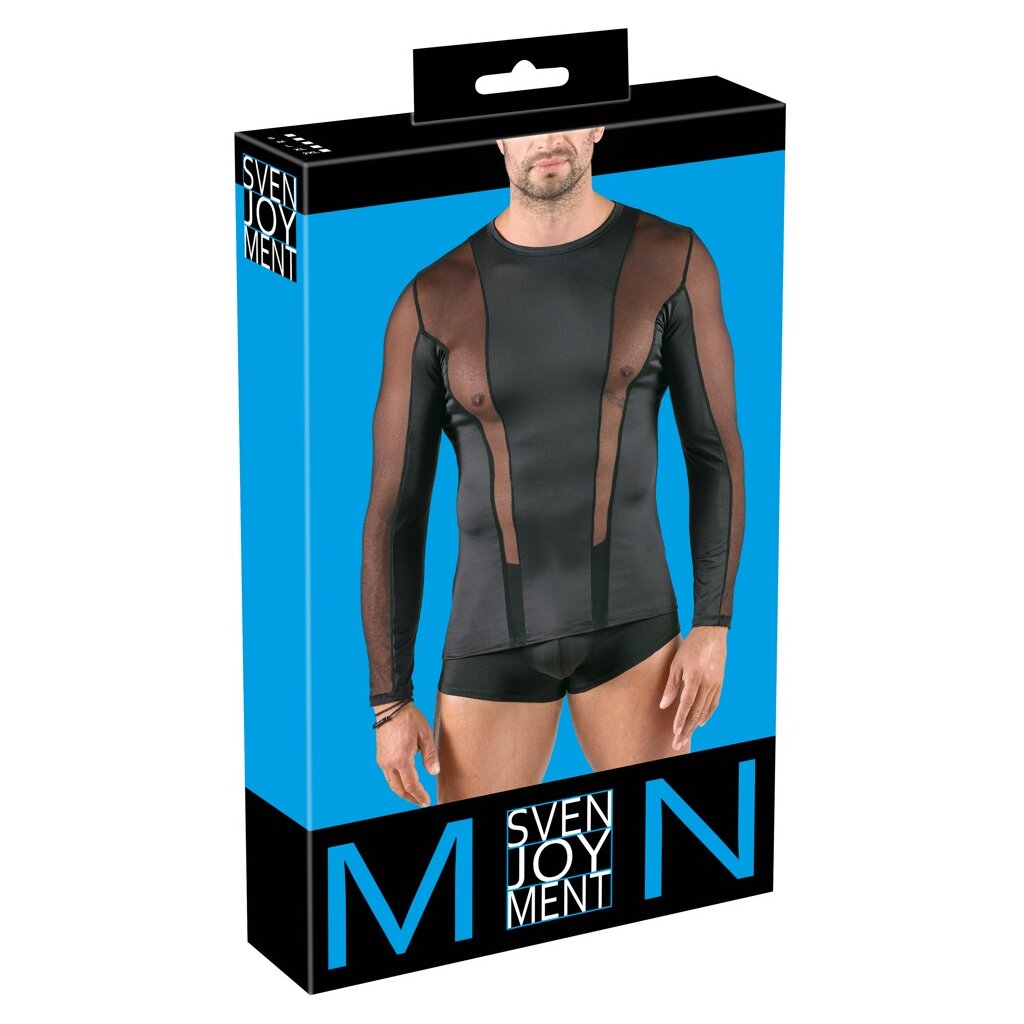 Schwarzes, figurbetontes Langarmshirt von Svenjoyment im stilvollen Zusammenspiel aus transparentem Mesh und blickdichtem Stretchmaterial. Der elastische Materialmix schmiegt sich weich an die Haut und ist sehr angenehm zu tragen.